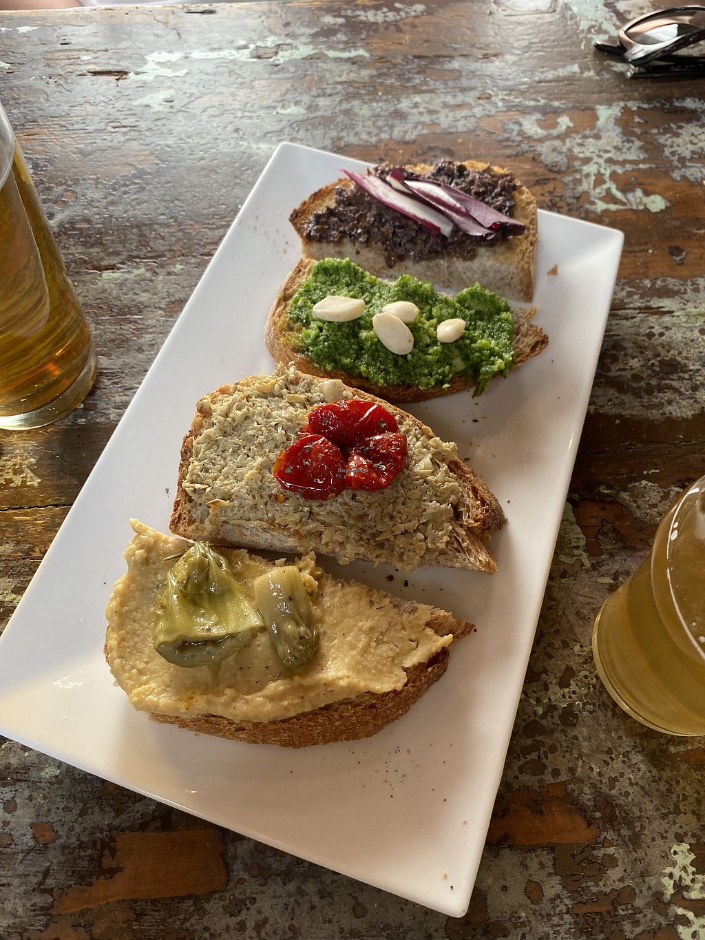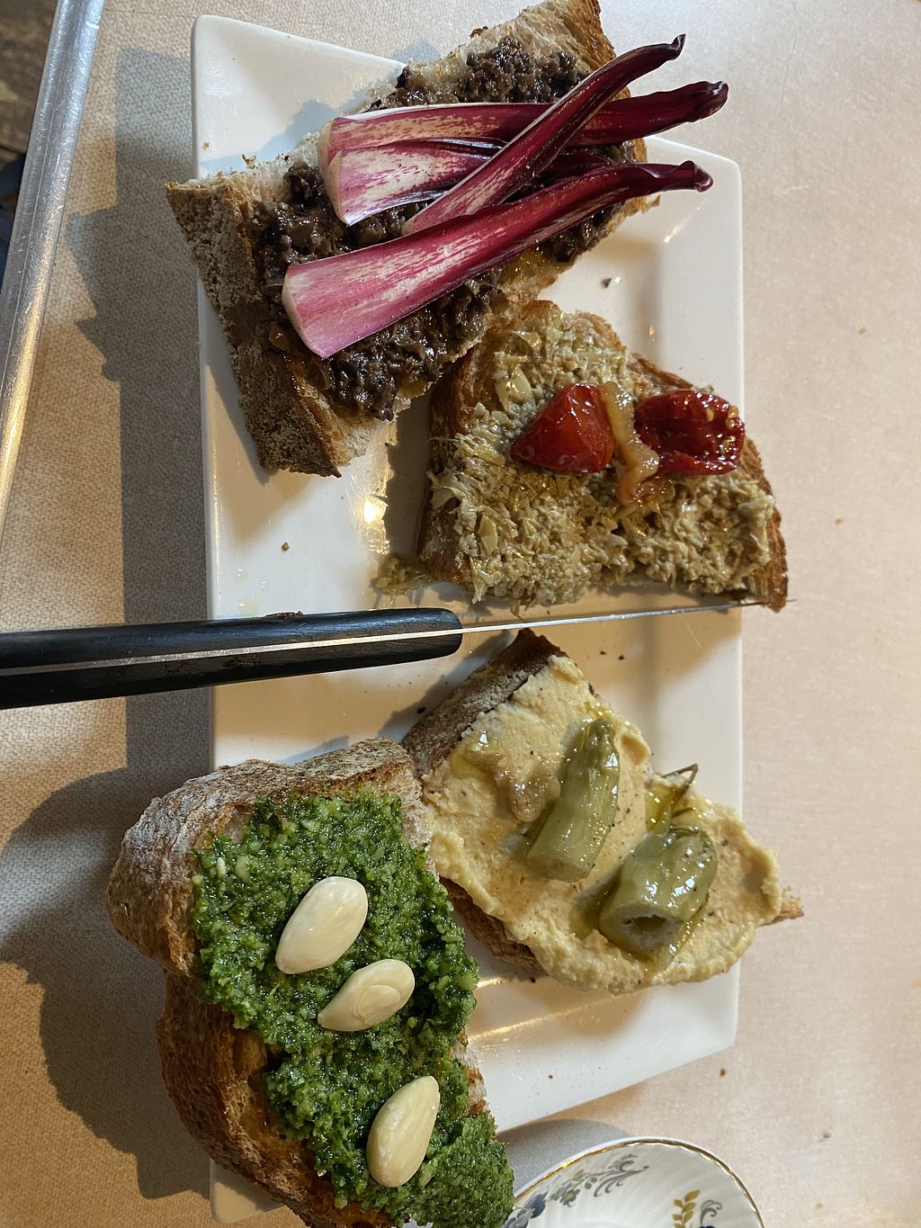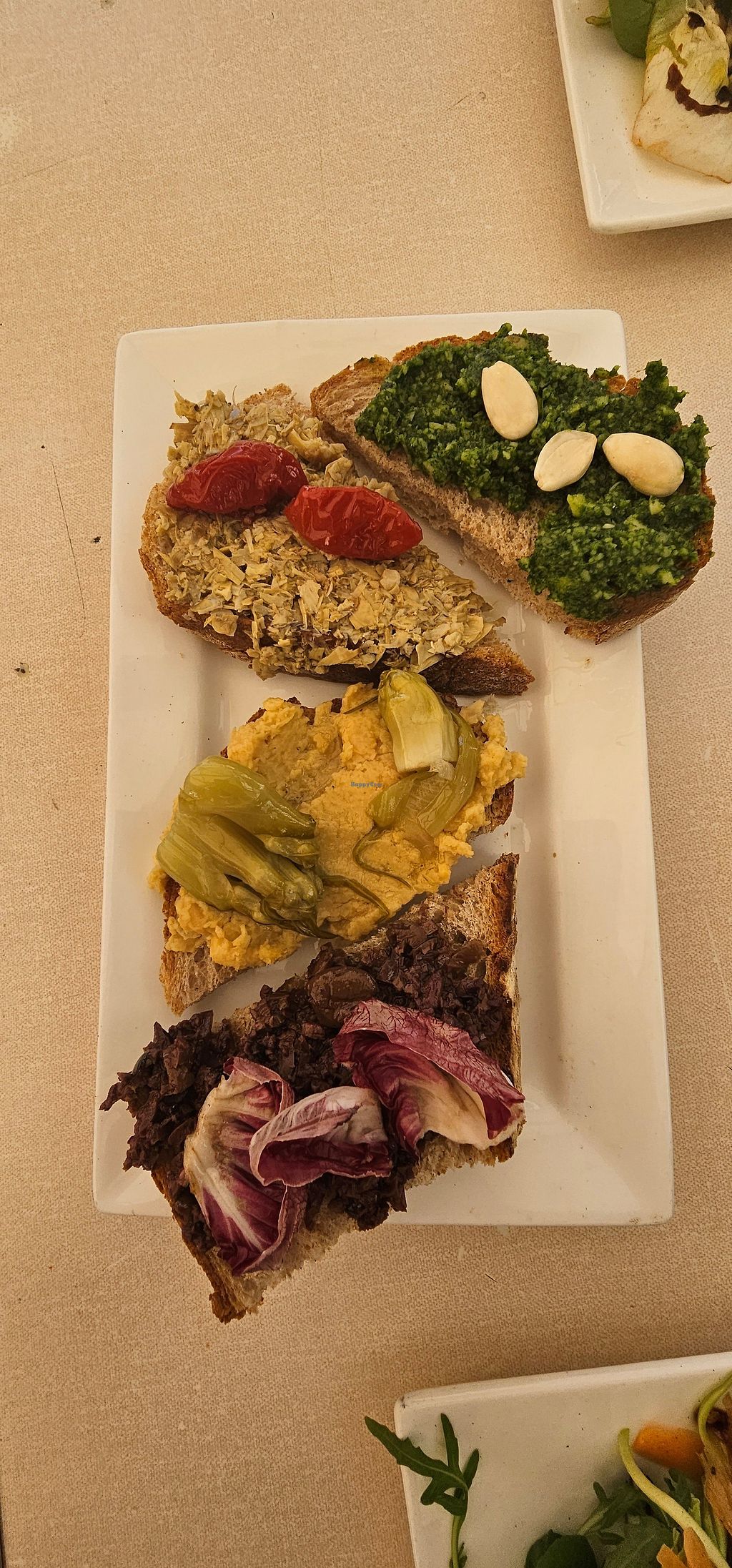 Crostini tasting plate with olive tapenade and chicory (top), artichok…