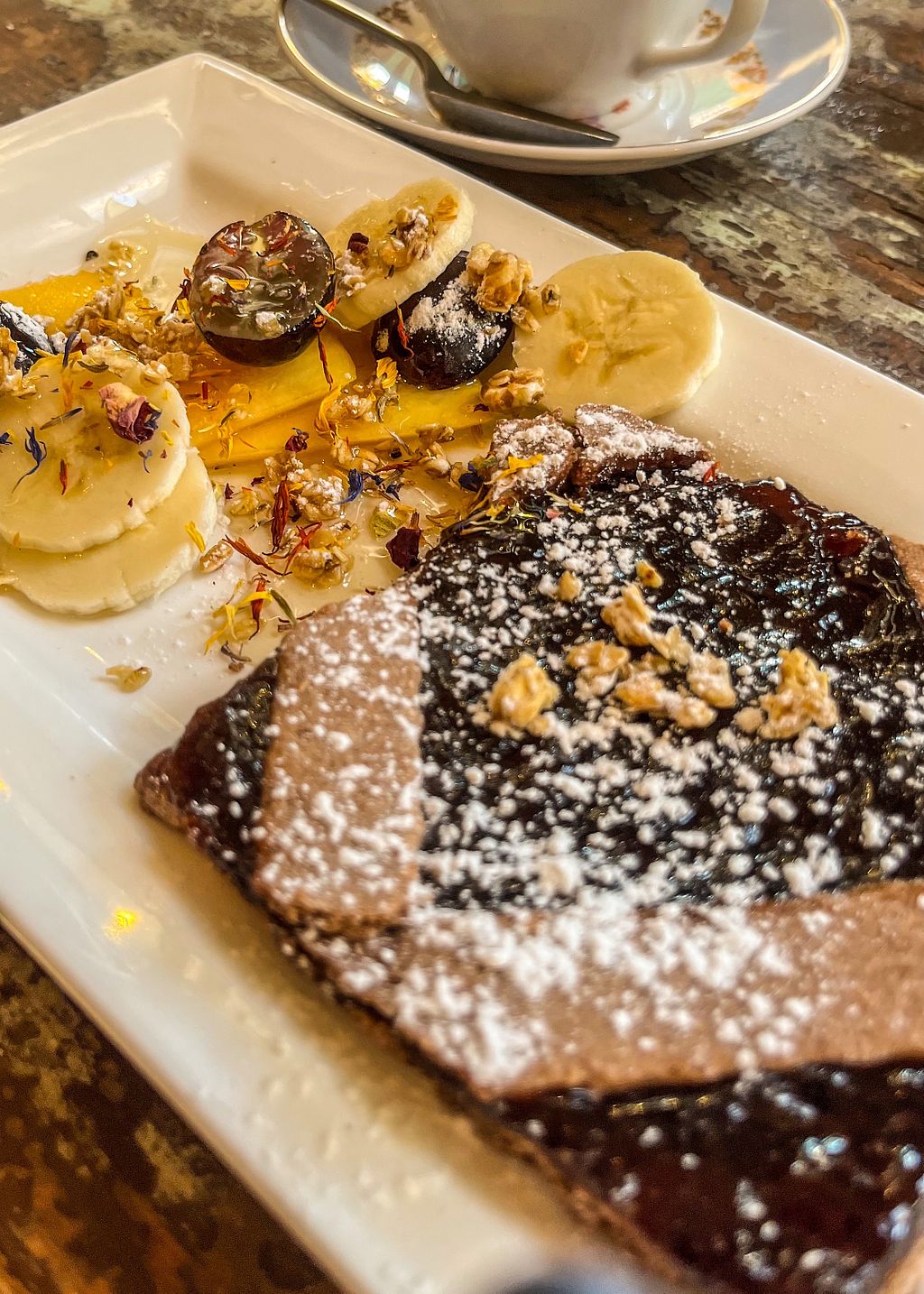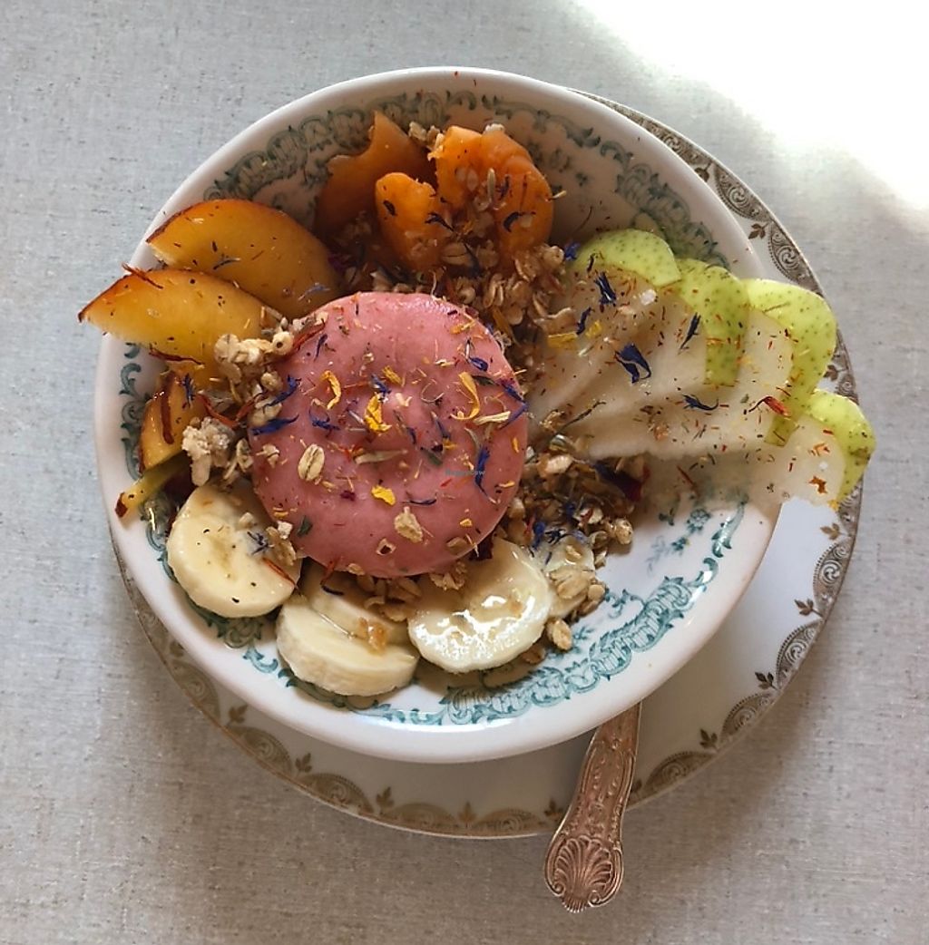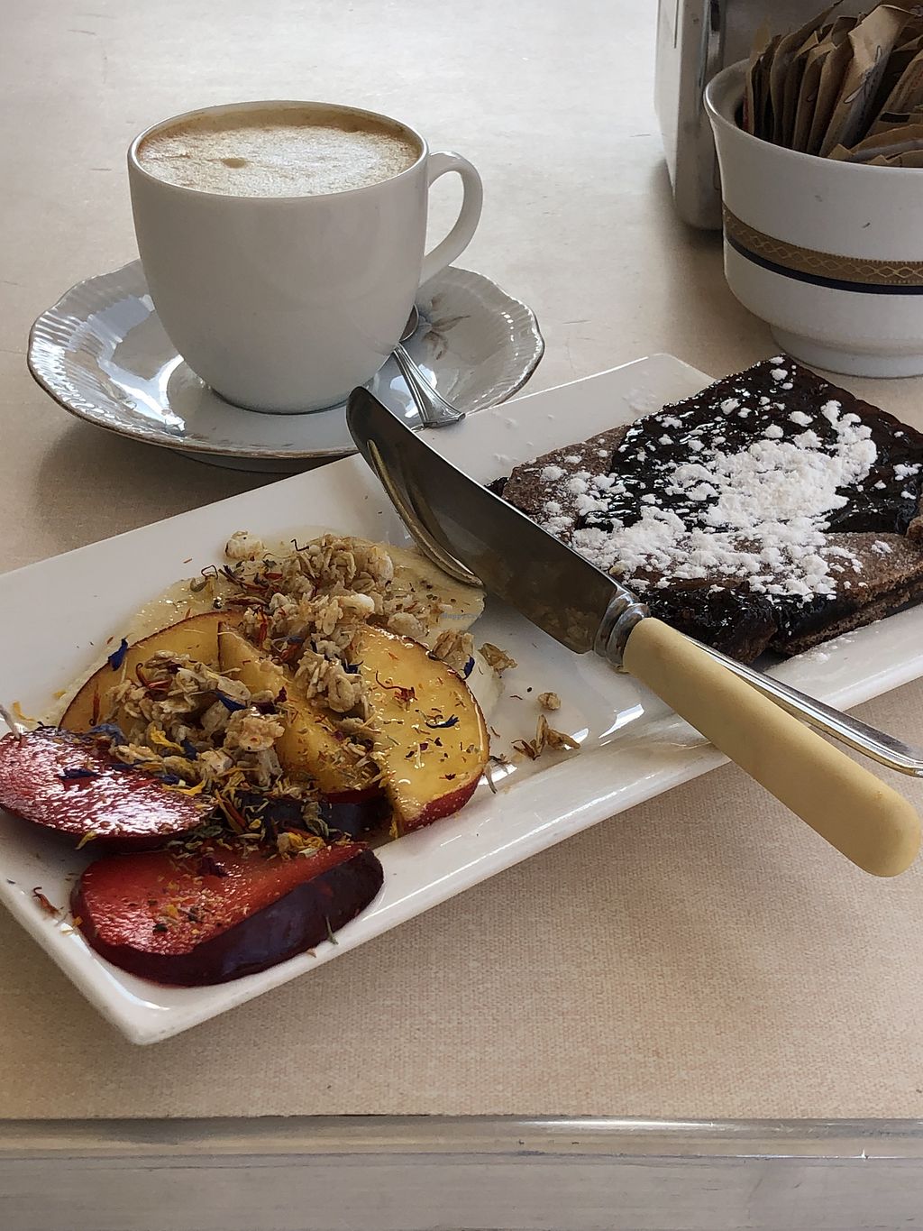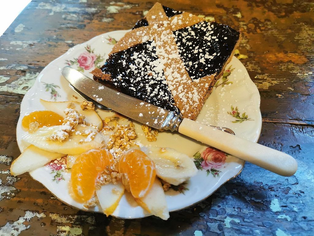 An oatmilk cappuccino & vegan forest berry tart w/ fresh fruit