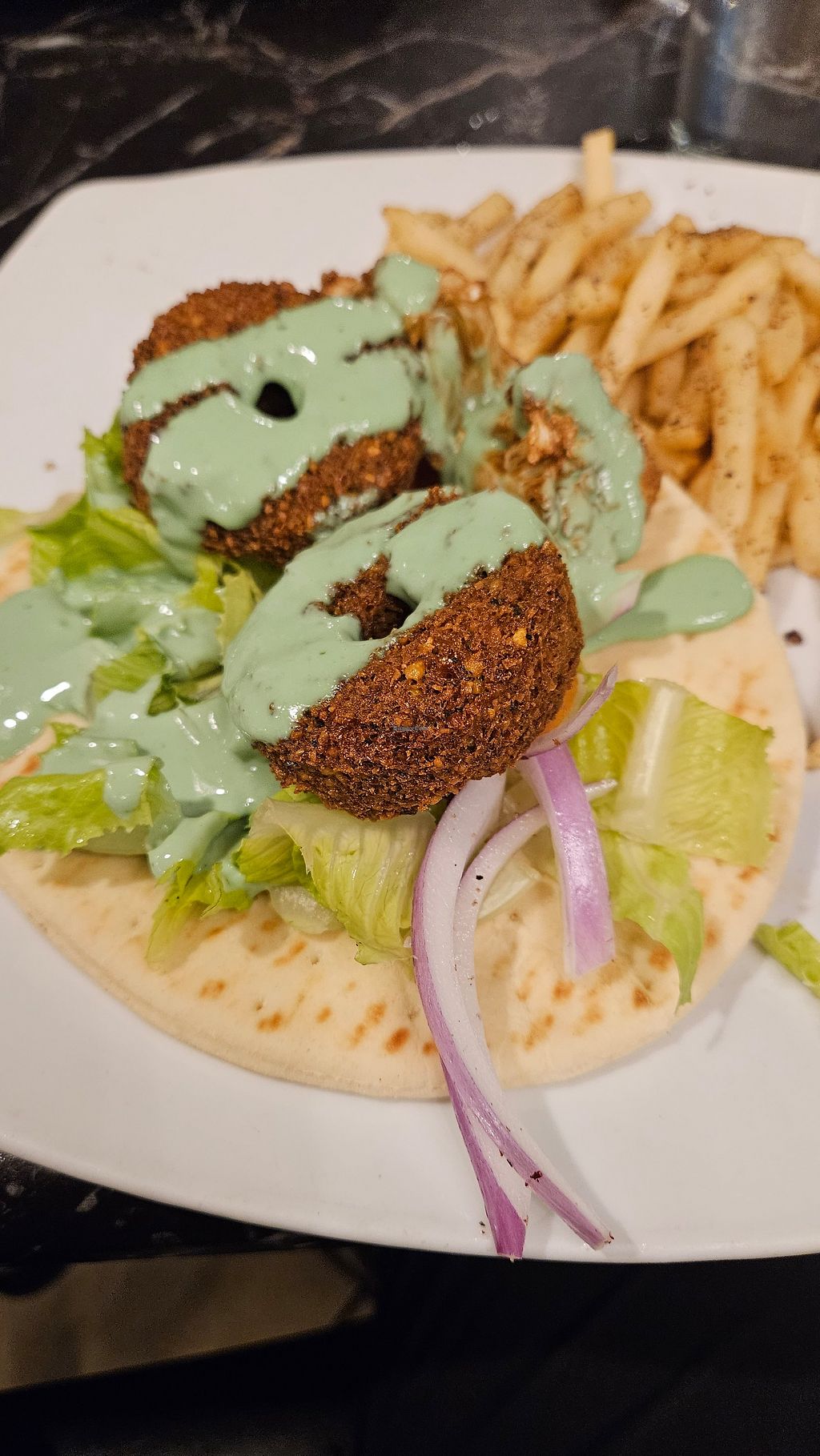 Falafel wrap with a side of fresh fries .