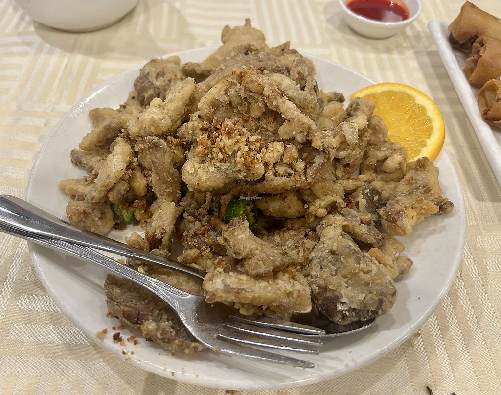 Fried rice, mushroom Shui Mai, Vegetable dumplings and deep fried mush…