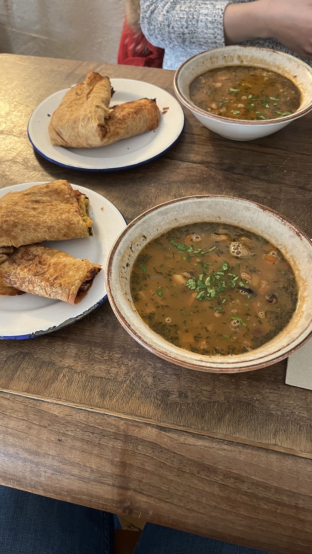 Banitsa with mushrooms & rice, vegan tapatop soup and smoothie.