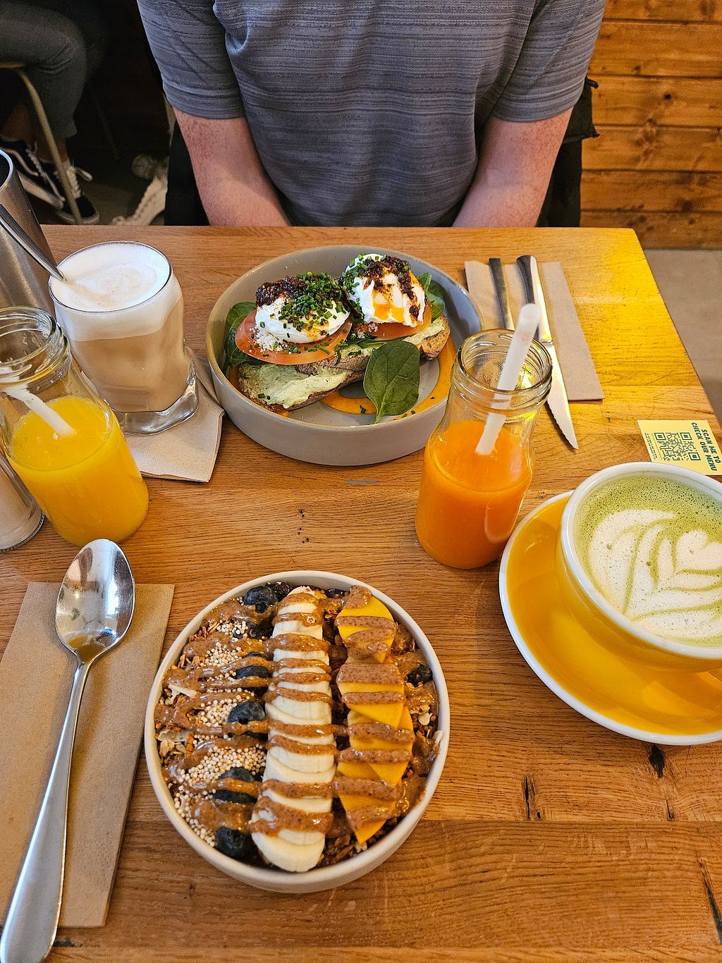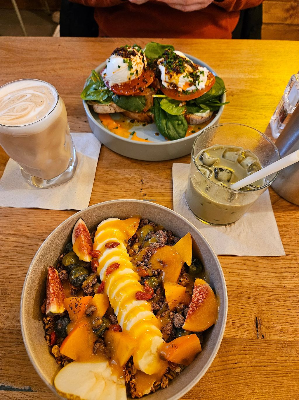 Mango Pancakes, Trüffel Bagel mit Scrambled Tofu, Hafer Cappuccino und…
