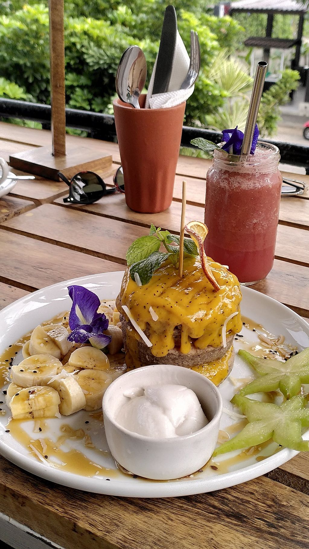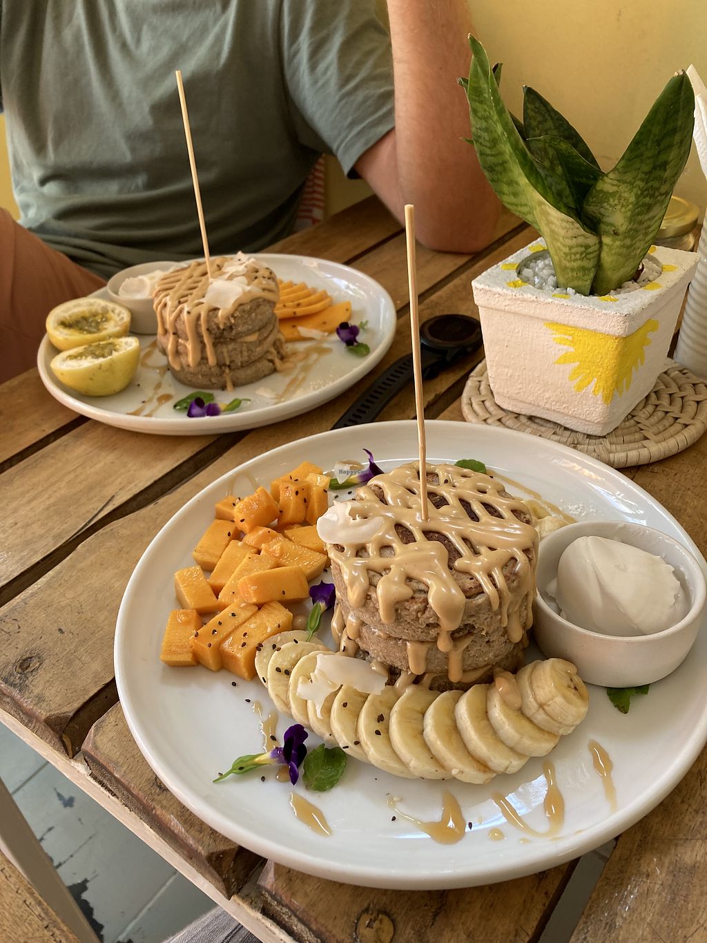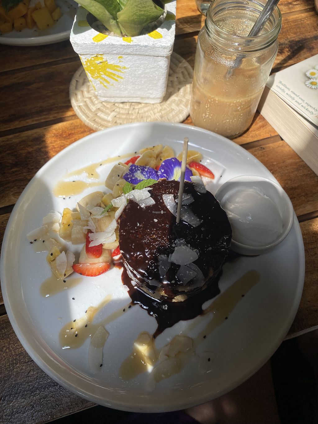 I had the vegan pancakes and the passion fruit soda. Both were very good in satisfying. Vegan Pancakes come with a side of honey (separate in a glass) maybe specify when you order that you don’t need it.
