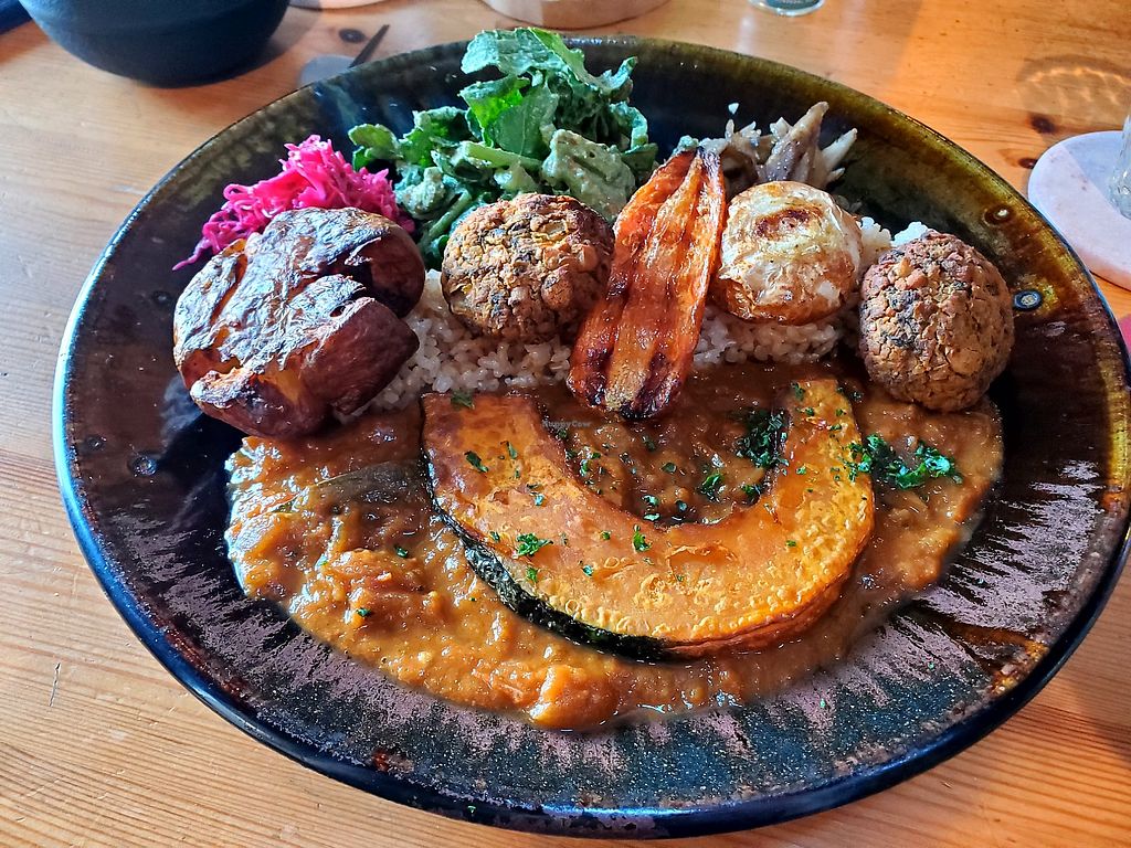 Large portions, filling food, and unique beverage options. This was unusual, but a very nice vegan meal. Wanted to try the desserts, but did not have room after the huge main dish! We were given a menu with one meal-set option, so no selecting items before ordering (except for drinks and desserts). We also had to make reservations in advance. It was all around a positive experience. I deducted one star because the meal was very good, but not really exceptional. I would recommend you try it once.