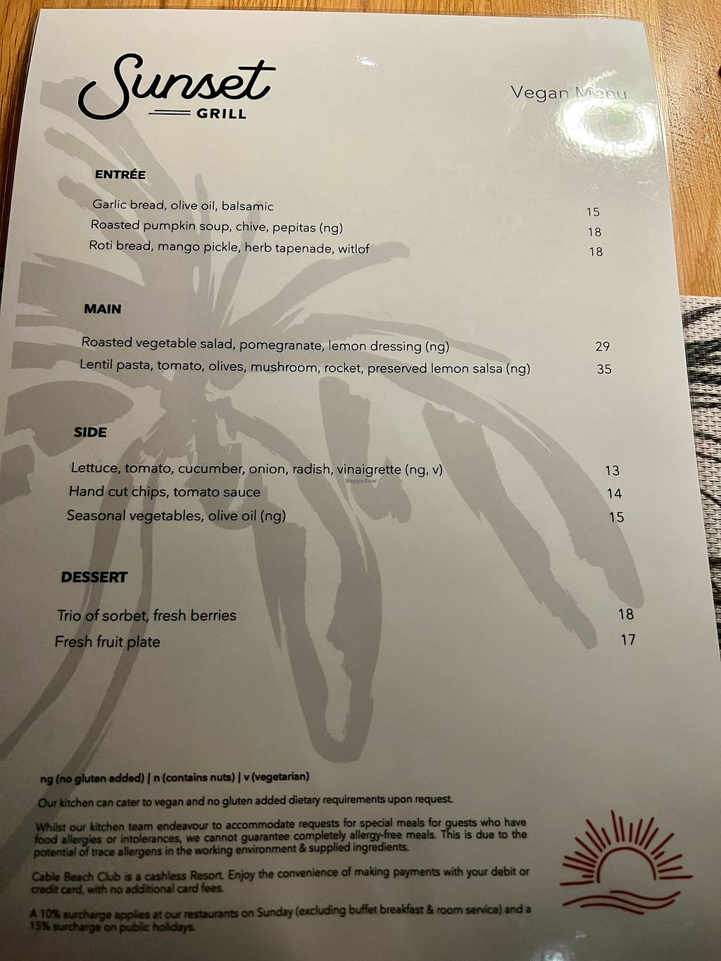 Full vegan menu at bar and restaurant. A bit pricey but like everything else at Cable Beach. You need to ask for the vegan menu. Some employees don’t know about it!