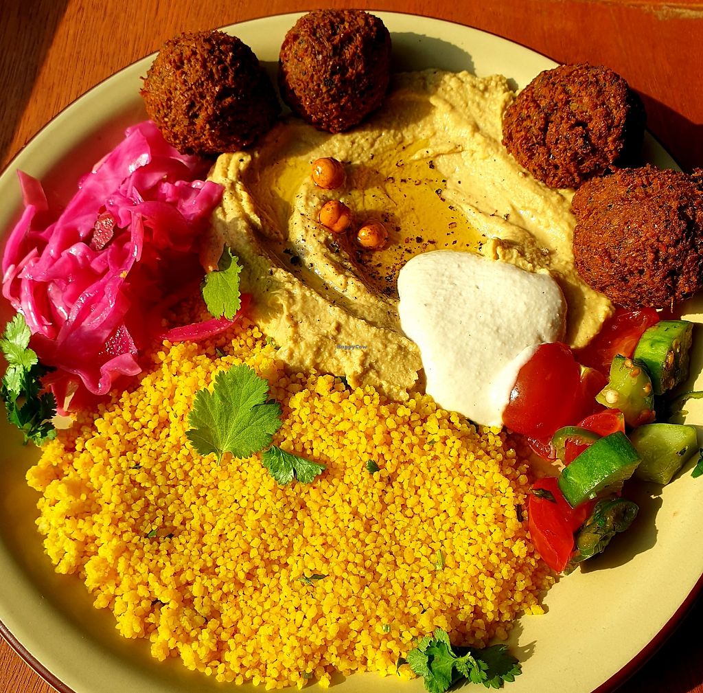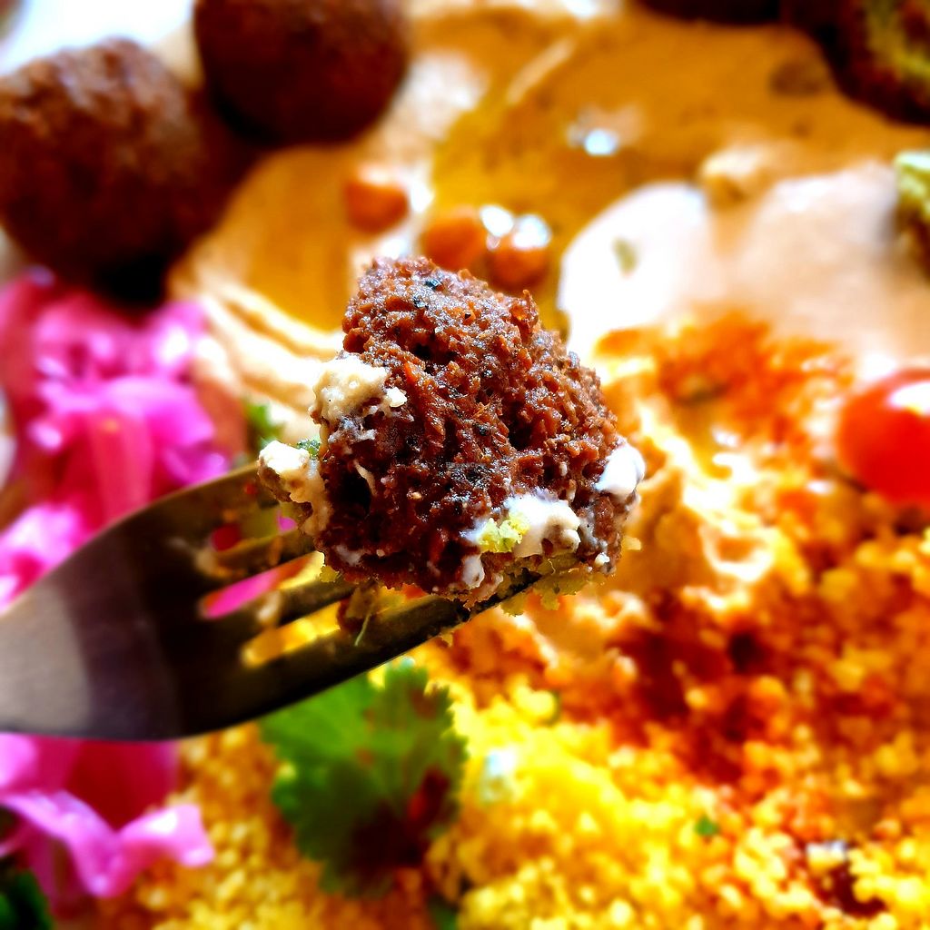 Serves meat, vegan options available. Offers a vegan Lebanese platter which comes with falafels. The Turkish has egg and dairy in it. The Greek platter and Mexicana both have meat in. Oat milk and a vegan mocha are also available. Reported closed July 2022.