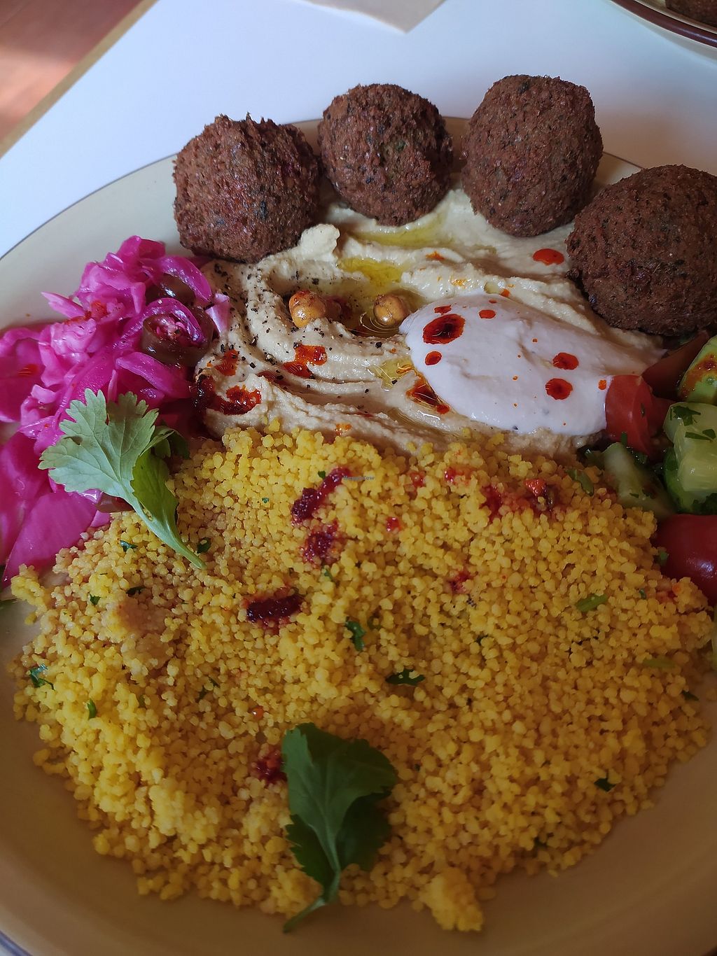 I really enjoyed the Lebanese platter at this place. Everything was delicious and the falafels were some of the best I've had. It was pretty filling and fairly priced The owner offered us some handmade chili oil which was excellent.