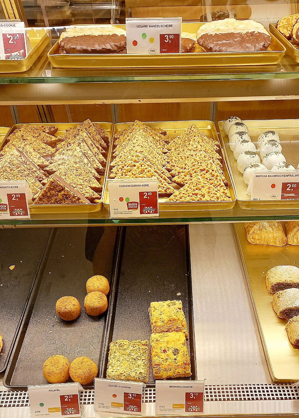 At the bakery, the vegan items are marked with a green dot, but unfortunately they were partly missing and there could be a bit more vegan offer. Hopefully, this will develop in the next weeks.