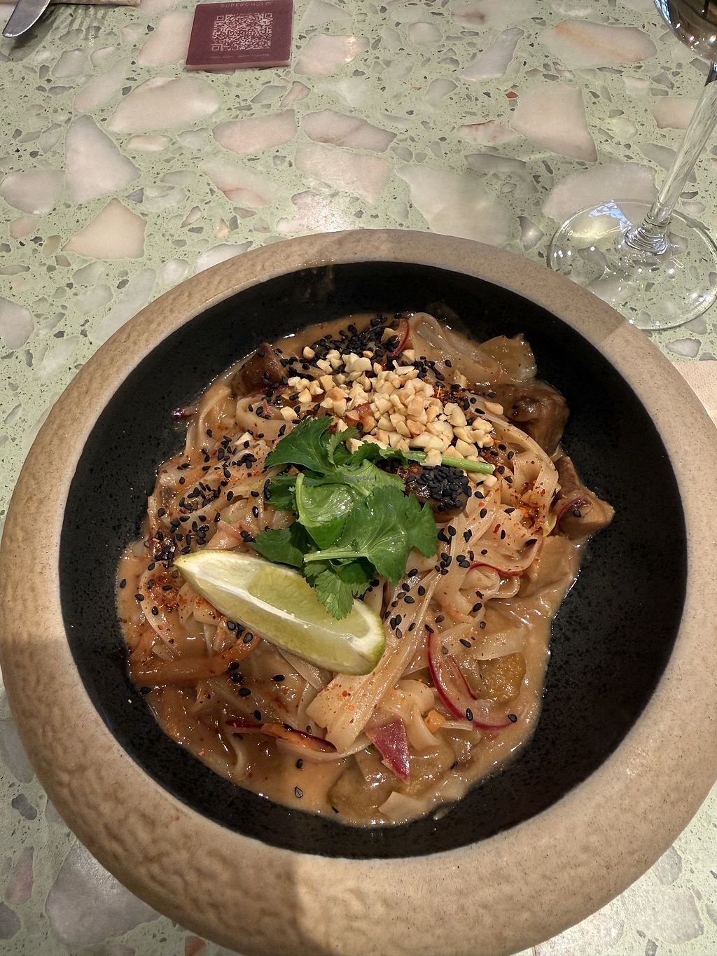 Pad thai con mucho sabor y helado vegano disponibles en el menú del día.