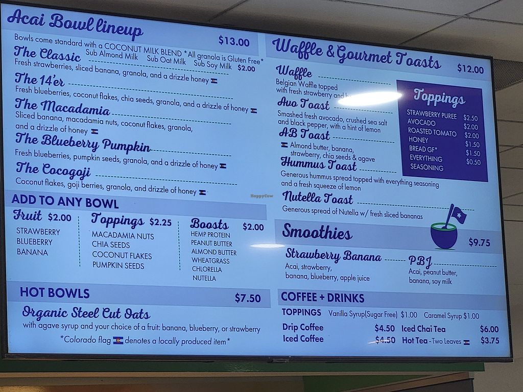 Menu not labeled at all. Everything is vegetation, some are vegan and some need honey, waffle, or Nutella removed to be vegan. Overpriced, but hey that's airport food for you. Had a macadamia bowl and hummus toast, both of which tasted good.
