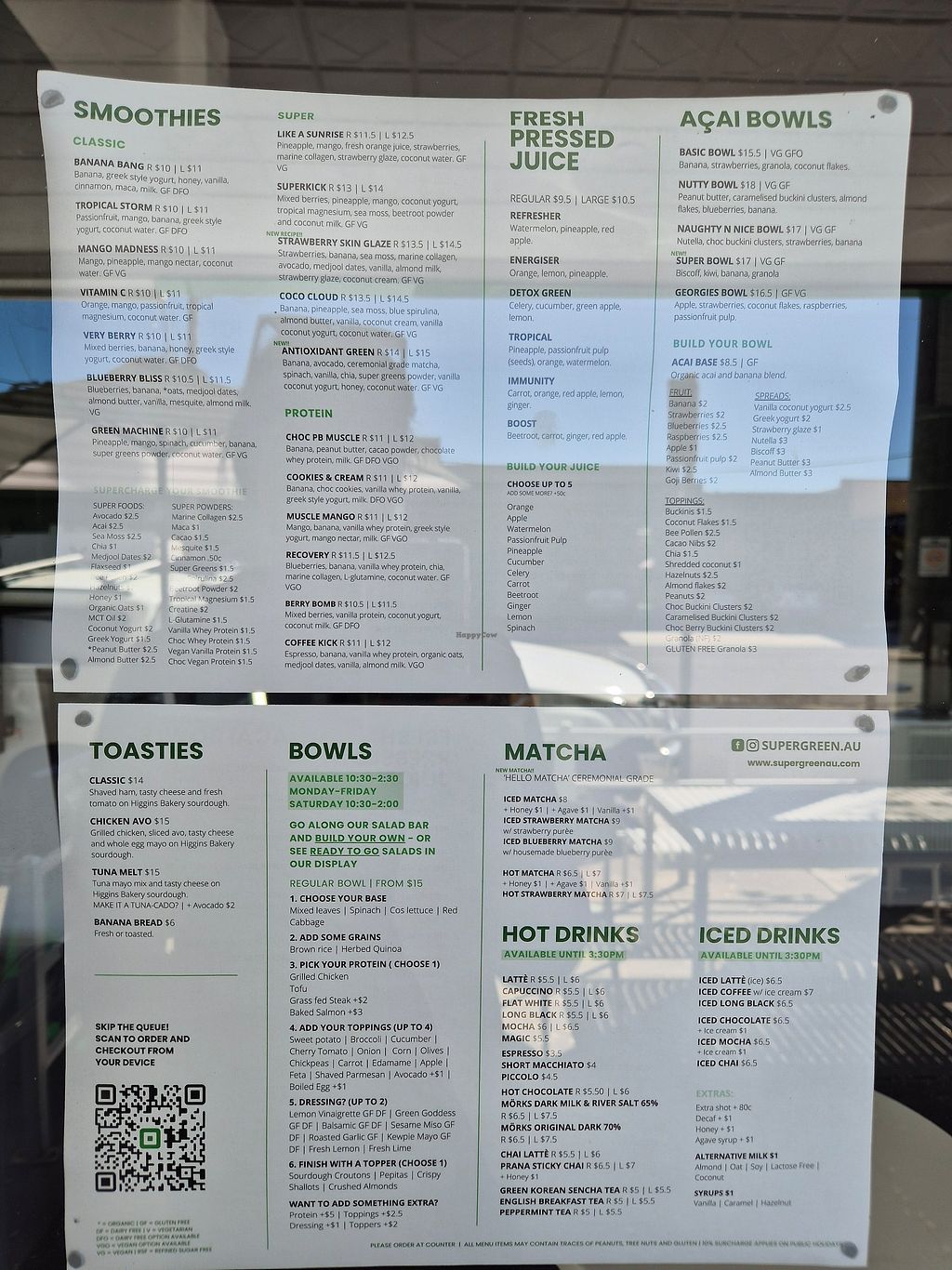 Juice and smoothie bar with acai and nourish bowls made in store. There's a takeaway fridge with yoghurt + fruit packs as well as pre-prepared nourish bowls. Meat and plant based proteins are available and you can also build your own bowl in store. ST. ALi coffee served here too. Open Mon 10:00am-2:00pm, Tue-Sat 8:00am-4:00pm, Sun 9:00am-3:00pm.