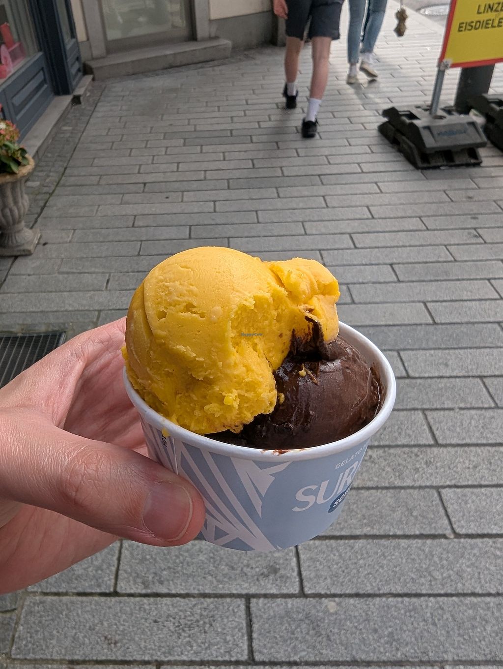 About 1.5 weeks ago I've been massively craving some ice cream while on a trip to Linz, so I visited a few places recommended by the app. In comparison to Greissler and Eisdieler this place had more (and more interesting) vegan options: not just the usual sorbets, but also flavours like sacher, pistachio and banana split - sadly however, none of the cones were vegan - at least according to the staff - so I left without trying any of them, since I did not want to get the scoops in a cup that only becomes trash 5 minutes later :/