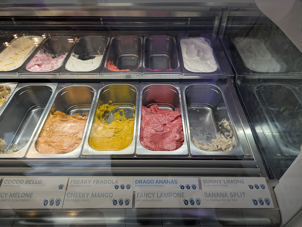 Ice cream shops with vegan options including sorbet and non-dairy ice cream. Cones are vegan. Open Mon-Sun 12:00-20:00. Open hours vary.