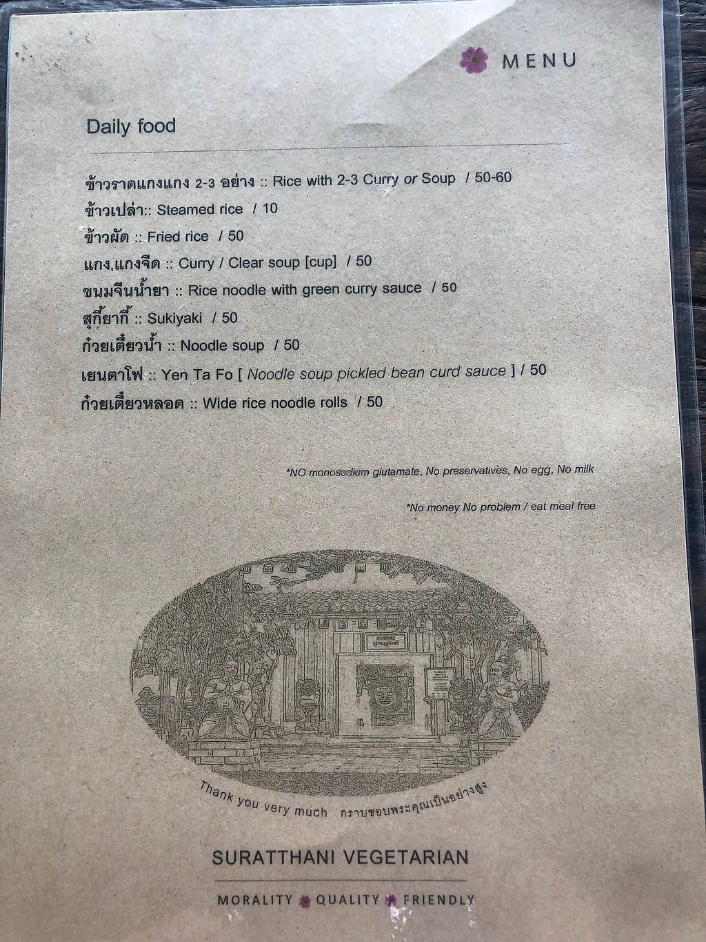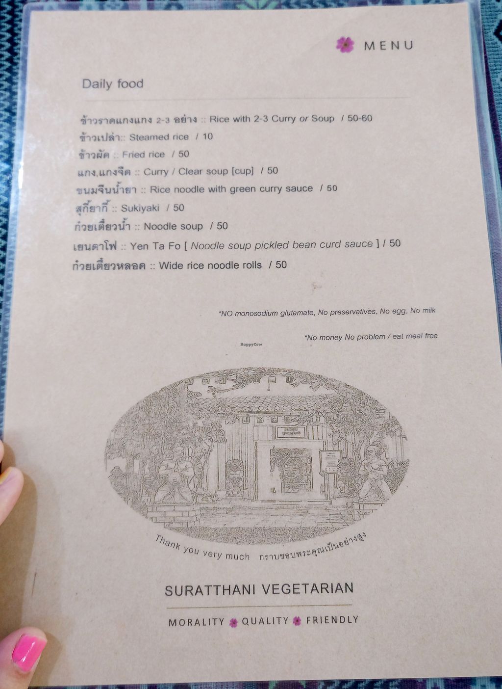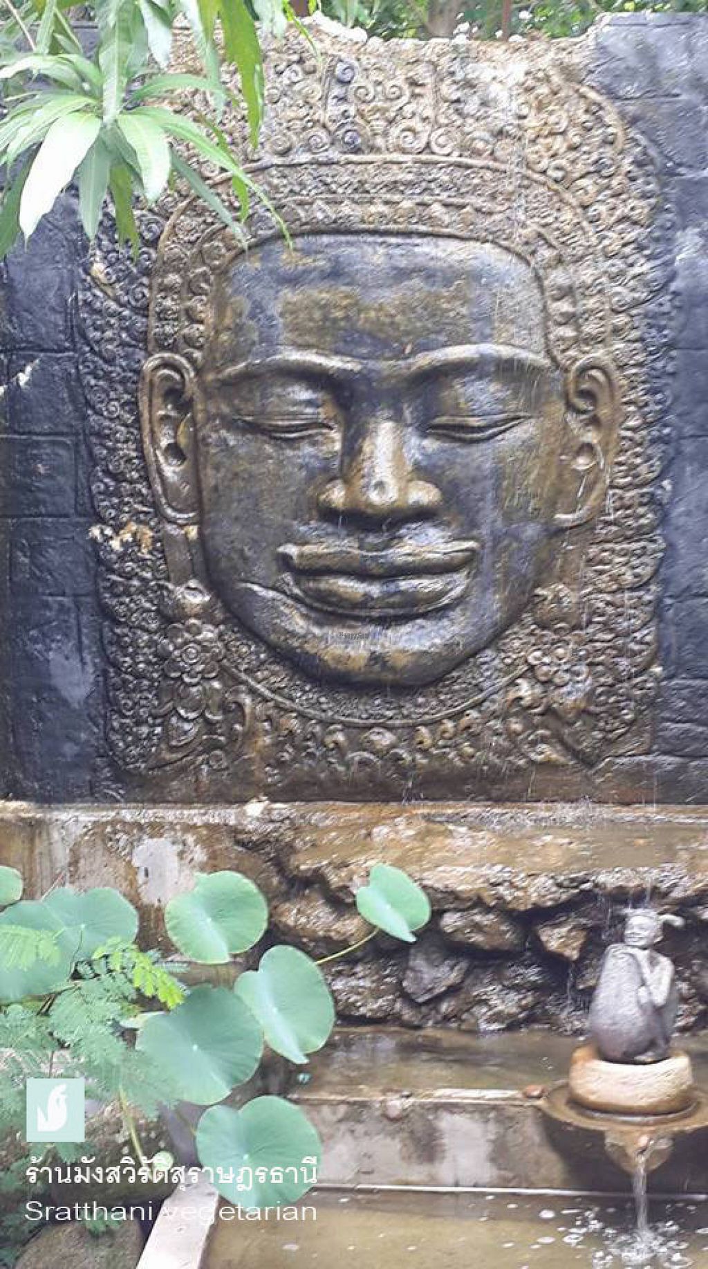 Althought it is pretty much the only vegetarian eatery in Surat Thani and not the easiest one to find, it is absolutely worth going and admiring. We arrived there when they we closing up already. They quickly re-opened the place for us and treated us with some delicious food: fresh garden-raised salad (there is a garden just by the side of the restaurant), exotic fruit juice, tasty curry; broth, dessert fruits (more and more!) plus delicious ginger tea free of charge. What we ordered was really cheap too, especially consisering the sevice and the quality). Loved it so much we went there again the next day.
