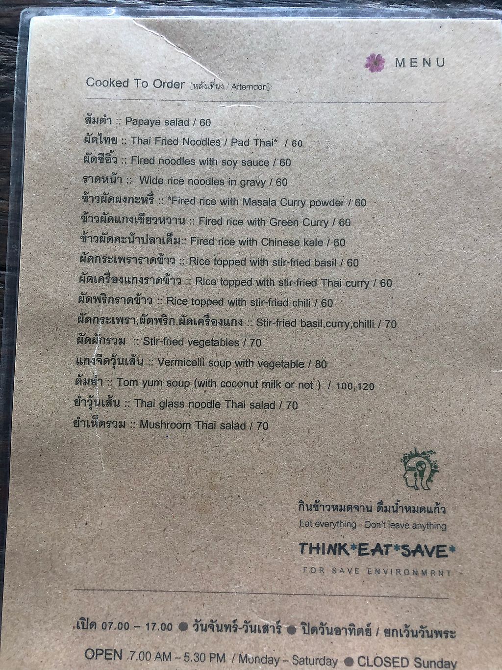 Read moreThe owner was nice, the food was good, and the prices, like all of Thailand, were cheap. 60baht for 3 items and rice from the buffet. The English signs around were about being kind to the environment and the animals. By the way, the sign says it’s closed on Sundays, despite other reviewers saying it’s free on Sundays. Overall, a good find!