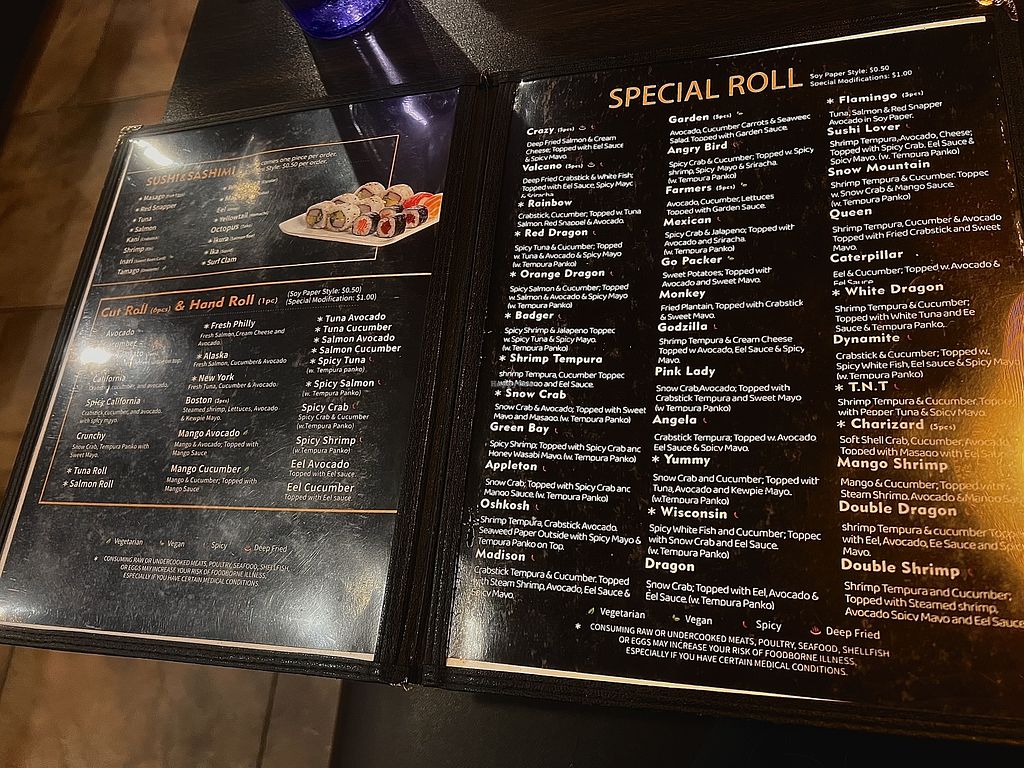 Read moreSeveral things on the menu are labeled as vegan, including some of the sushi rolls and hibachi items. We asked about something that wasn't labeled vegan, and the server didn't know the answer, so he just brought us the allergen list. When looking at it, my wife noticed that it said the sauces that were used on the vegan rolls were not in fact vegan. So basically they label items as vegan, which the item itself may actually be, but the sauce they put on the top of it is not. Which means ITS NOT VEGAN! Like what is the thought process behind this? This would be like labeling a Beyond Burger as vegan, even if it were smothered in non-vegan mayo. Like WTF?!?!?