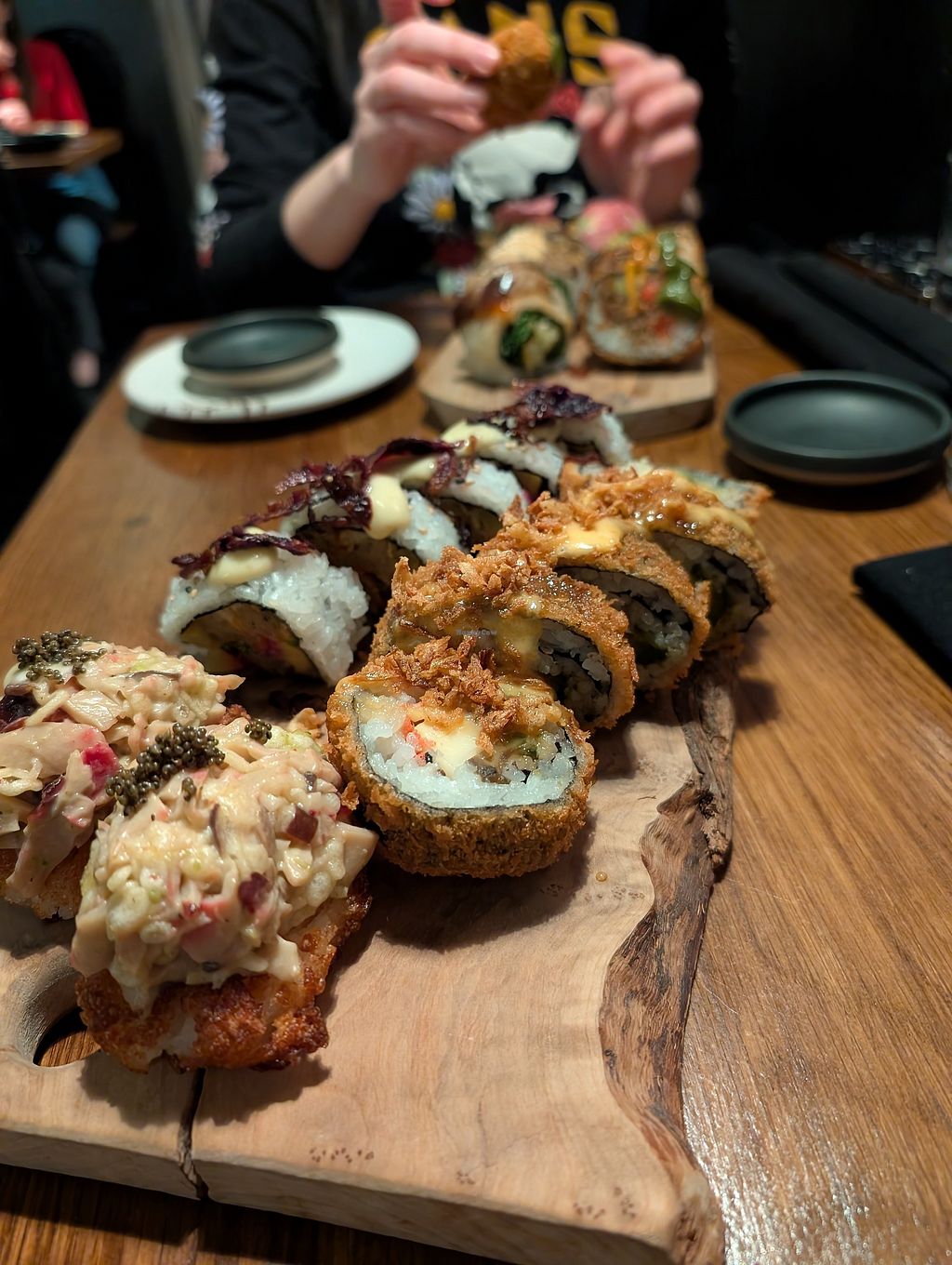 The most incredible sushi I have ever had. Each roll is large and exquisitely presented with amazing combinations of flavours. It would take several visits to taste everything on the 100% vegan menu. Even the soy sauce had a delicate unique flavour. The ambiance is top shelf and tge staff is very friendly and helpful.