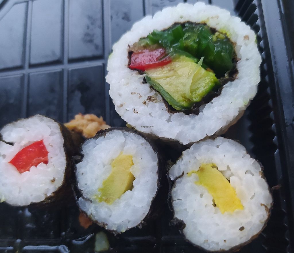 Serves meat, vegan options available. Takeaway sushi shop with separate vegan menu section that includes a range of vegan sushi rolls, inari and poke bowls. Open Mon-Sun 16:00-22:00.