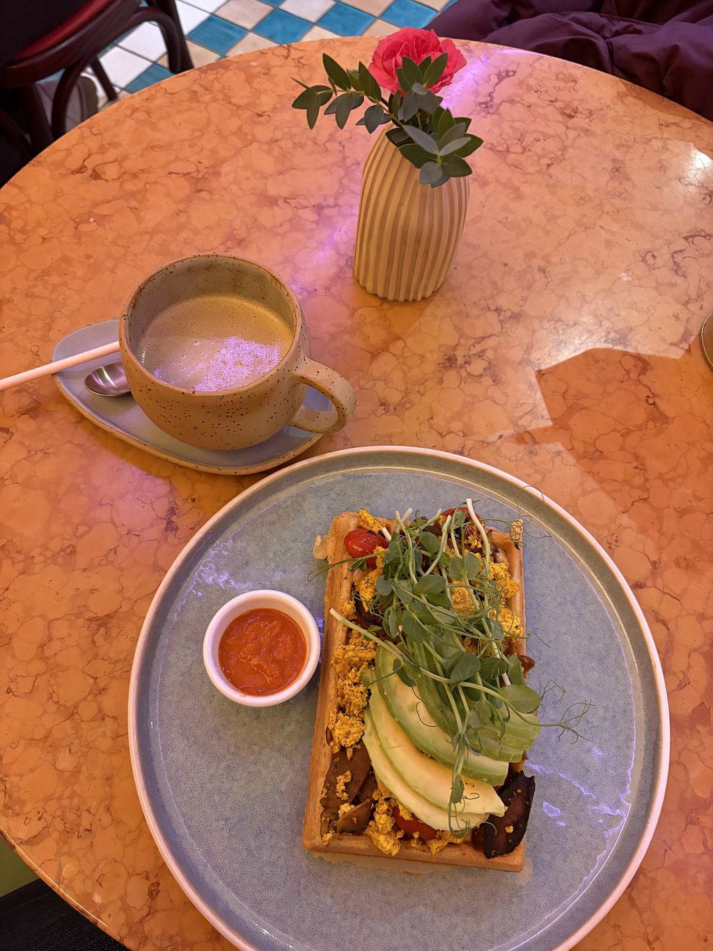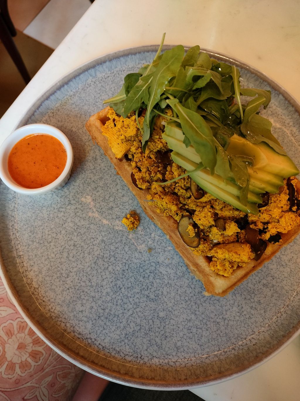 I had the savoury waffle loaded with tofu scramble, smoky sausage, avo, veggies and a delish creamy sauce. It was rich, flavourful and filling - a perfect dish!! 😍
