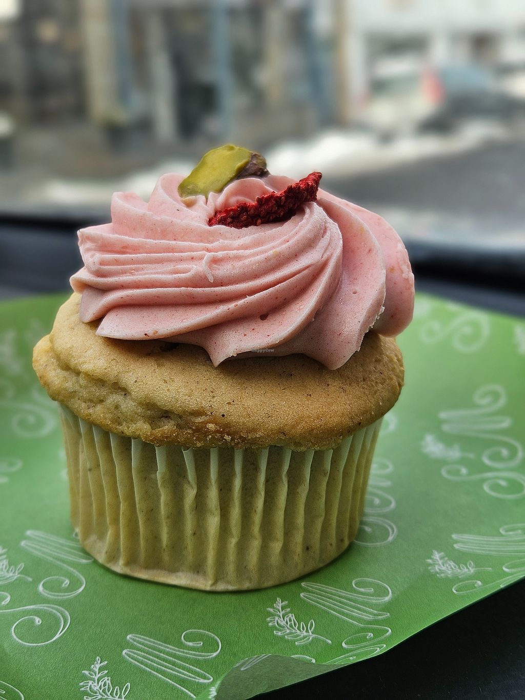 Pistachio cupcake with strawberry frosting