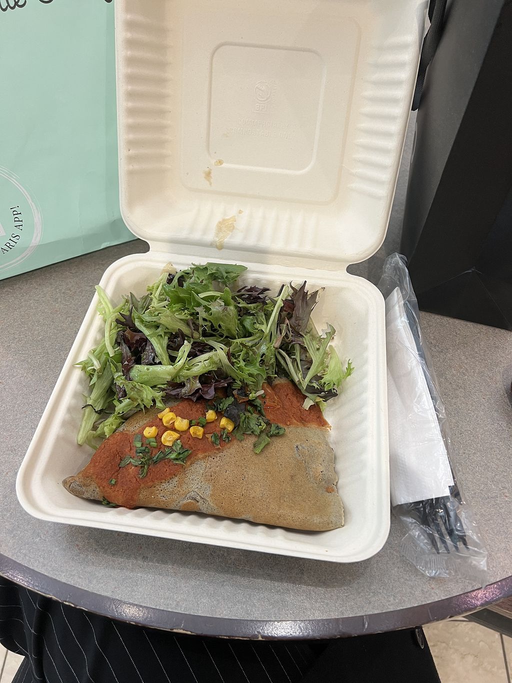 "The Vegan" savory crêpe was both satisfying and flavorful. Served with a side salad—a somewhat unexpected addition for breakfast—it still complemented the meal without taking away from the experience.