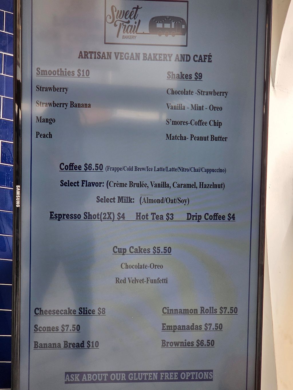 Me and my bf had warmed blueberry scone, cinnamon bun, chocolate chip cookie, smores shake, and vanilla shake! and it was all vegan!! so good. 5 stars. its got seating on the side in a bar stool style. so no face to face tables but we had plenty of bar stools to sit at.