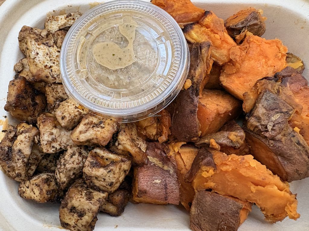 Recently, I needed something quick and I got tofu and sweet potatoes with spicy cashew dressing for $7.