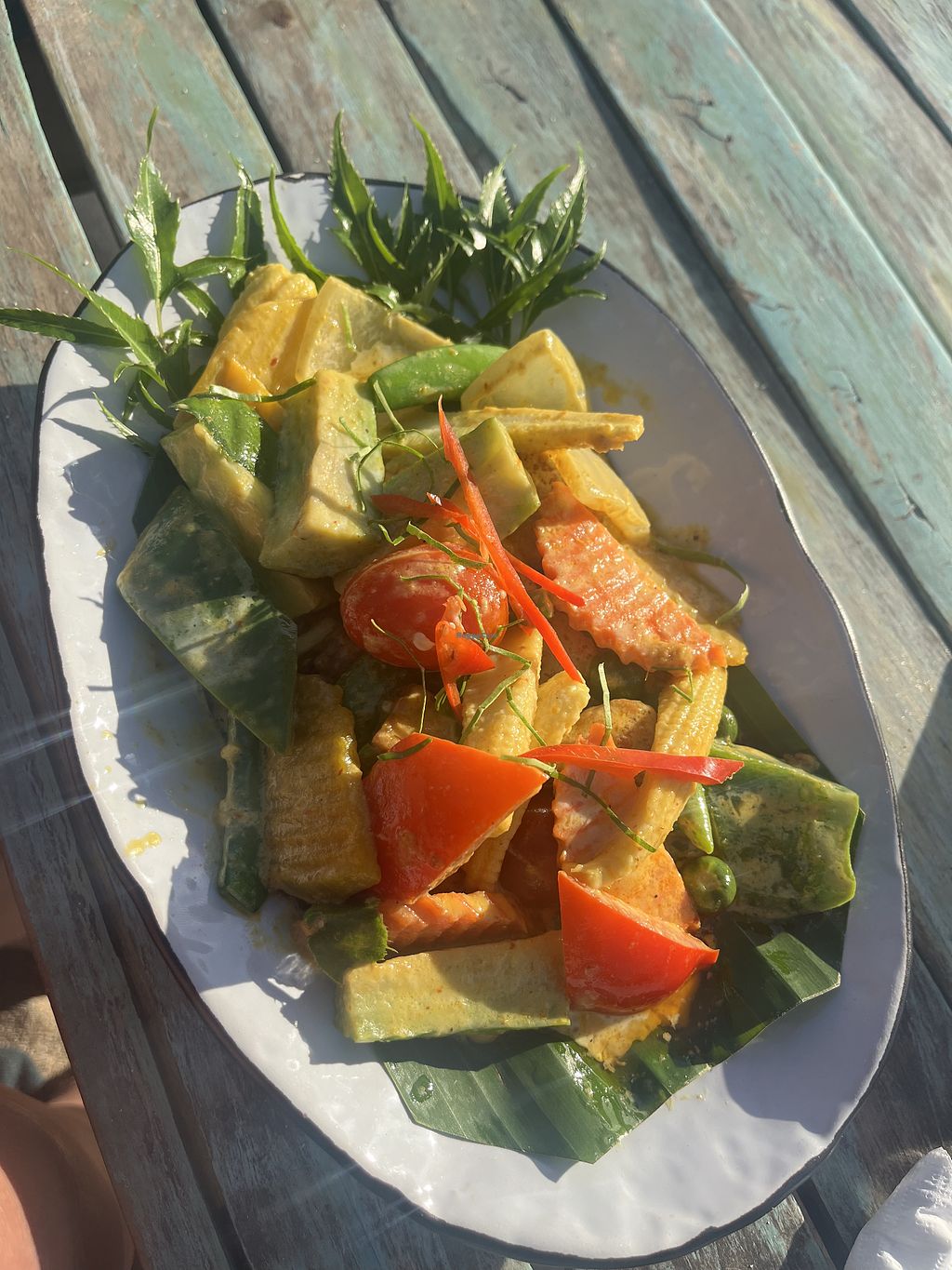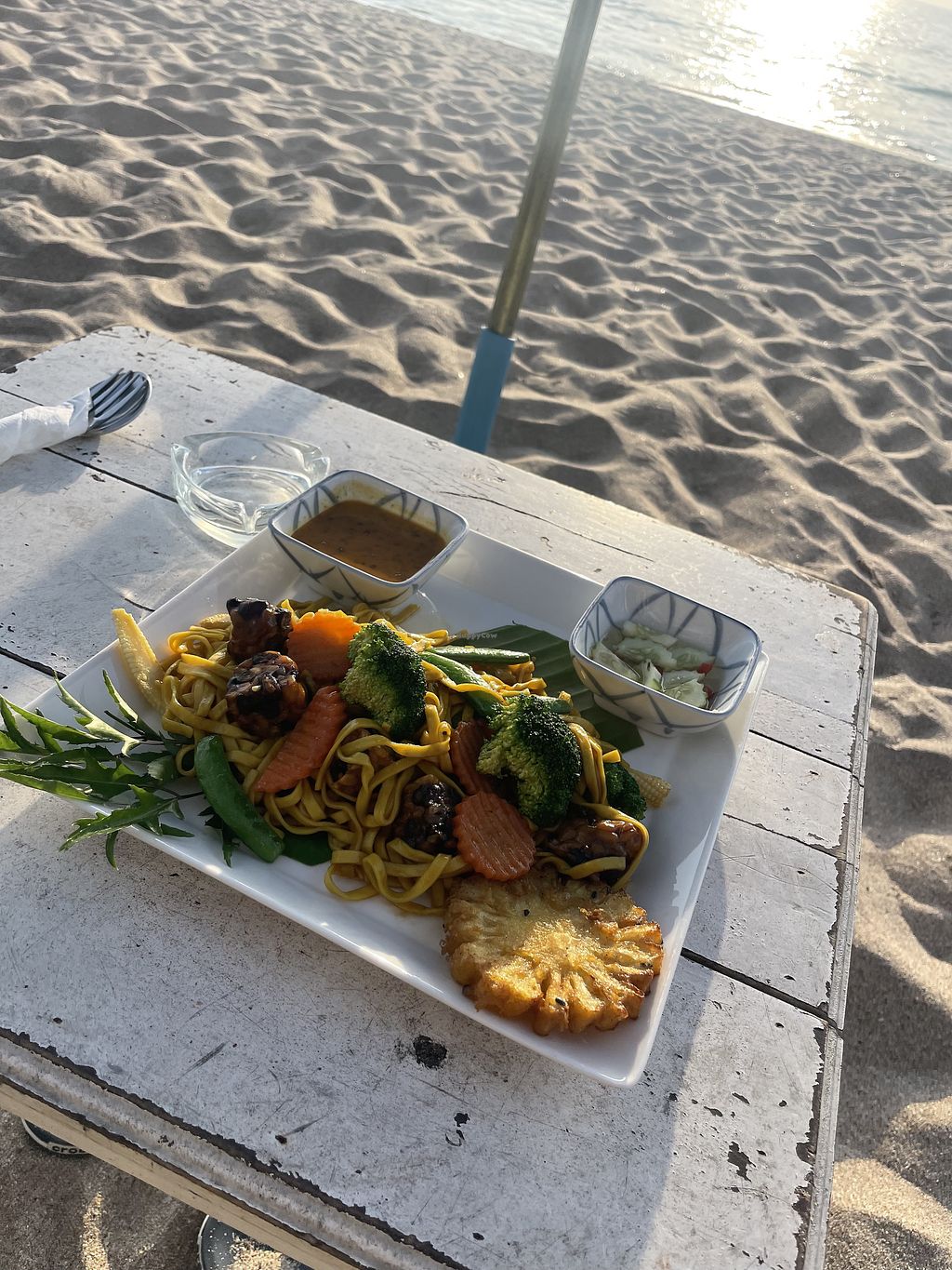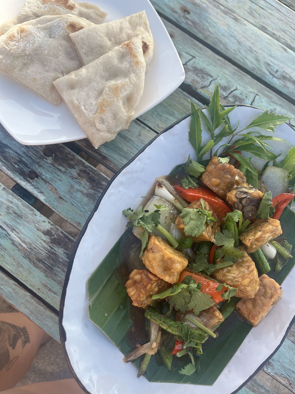 This place deserves all the great reviews on Happy Cow. Beautifully situated right on the beach. The menu is almost entirely vegan. We had garlic bread, sweet potato fries with homemade vegan mayo, then fried noodles with Veggies, Tempeh and Sate sauce. My son ordered Panang Curry with Tempeh. We also had grilled tofu with peanut sate and homemade cucumber relish. Everything was absolutely delicious.