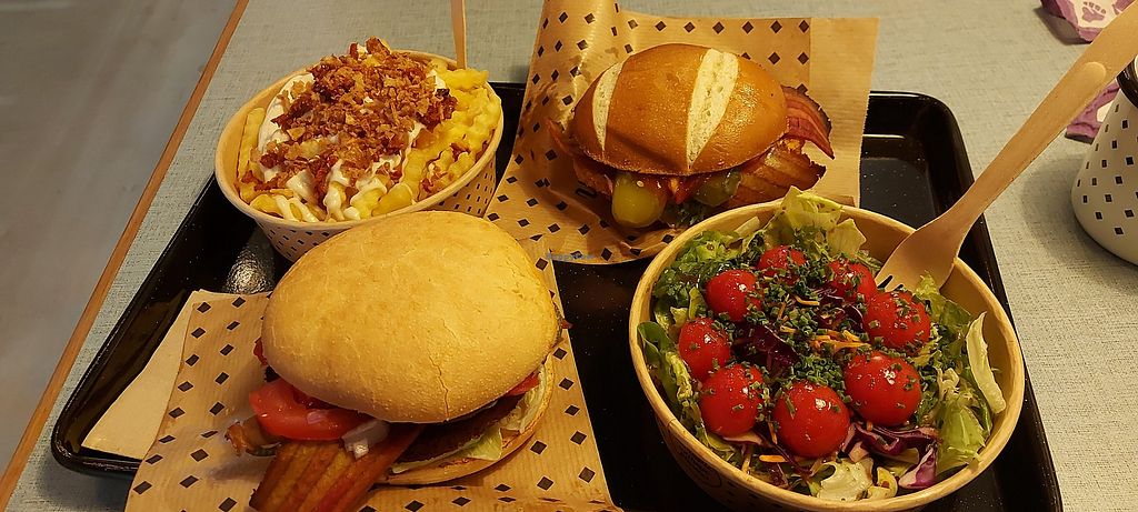 they have a variety of burgers, French fries , f.e. with garlic or barbecue sauce etc. Even salads and Chili "cheese" nuggets. it's simply delicious !!!