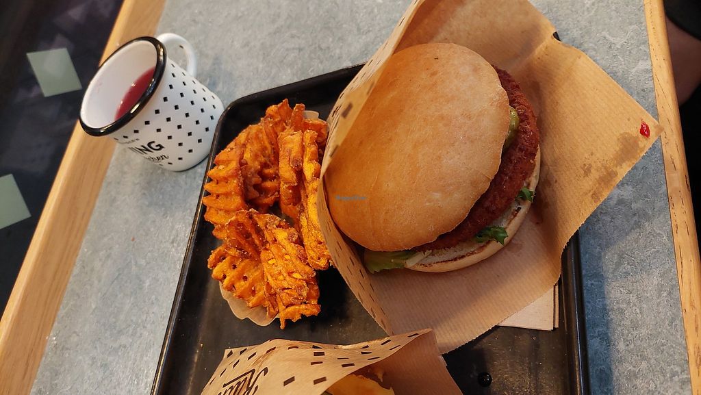 First off the staff are super friendly and helpful. Lots of great 100% vegan options, we struggled to choose. We ordered the kitchen wrap with hot pepper sauce, the chille burger, regular fries, sweet potato waffle fries (amazing with the barbecue dip), chilli cheese bites and onion rings. We also got 2 drinks, which you served yourself in enamel cups.. think coca cola freestyle but with much more interesting options like colas, sodas and ice teas. Would 100% eat here again or at any of the Swing Kitchen restaurants if I was in a city which had one.