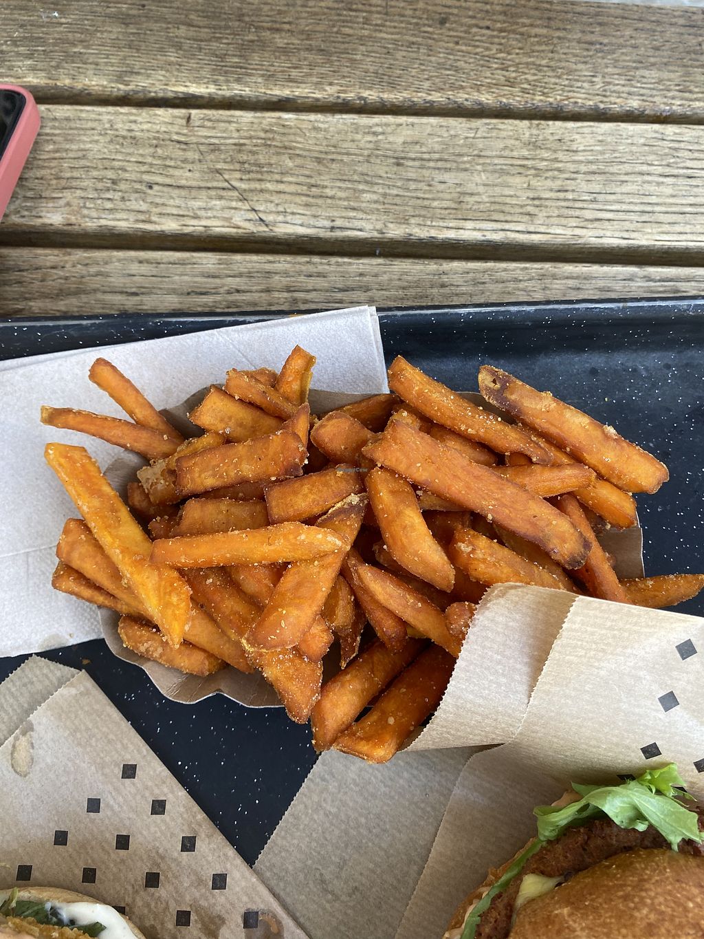 Wir hatten den Bavaria Burger und den Chili cheeze Burger, der wirklich scharf war. Dazu Süßkartoffel Pommes und potato Pops. Alles war sehr lecker.