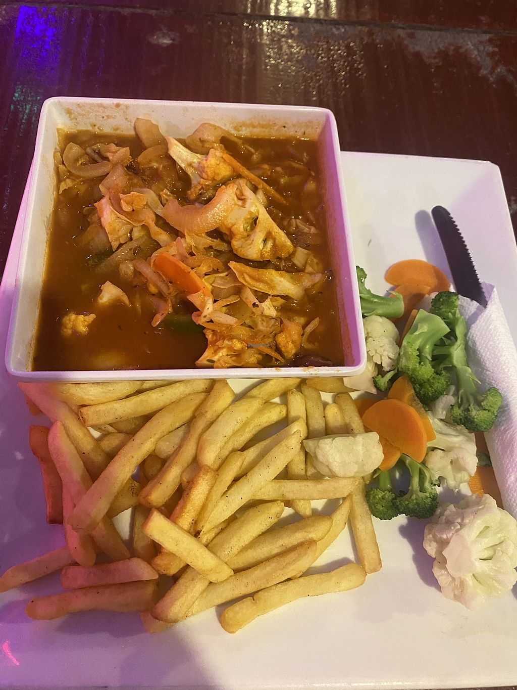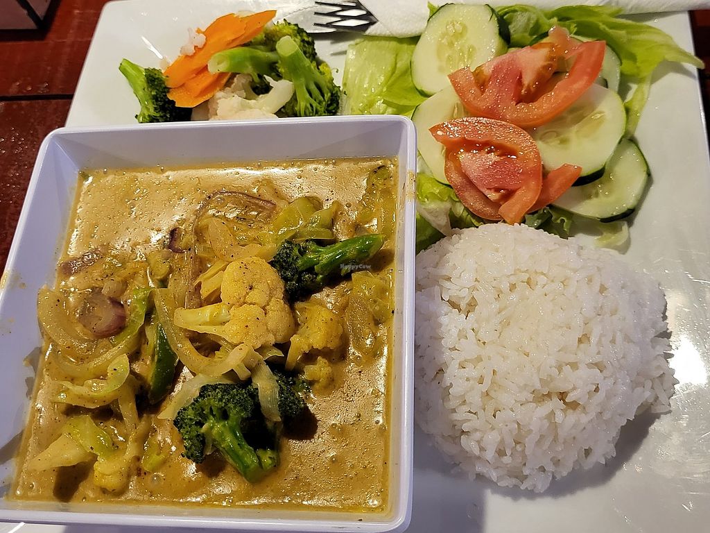 The food arrived really quickly, I got the veggie coconut curry, to make it vegan I switched the garlic bread and the calslaw that has mayo in it to steamed vegetables and a garden salad, you can also switch it to french fries. The curry was amazing, very nicely seasoned, the coconut rice was perfect I could have eaten an entire bowl of it if I had the option. The dish was a good size so it was nice filling, the side options were a little bland but I asked for salt and it was fine in the end, I really enjoyed the curry!