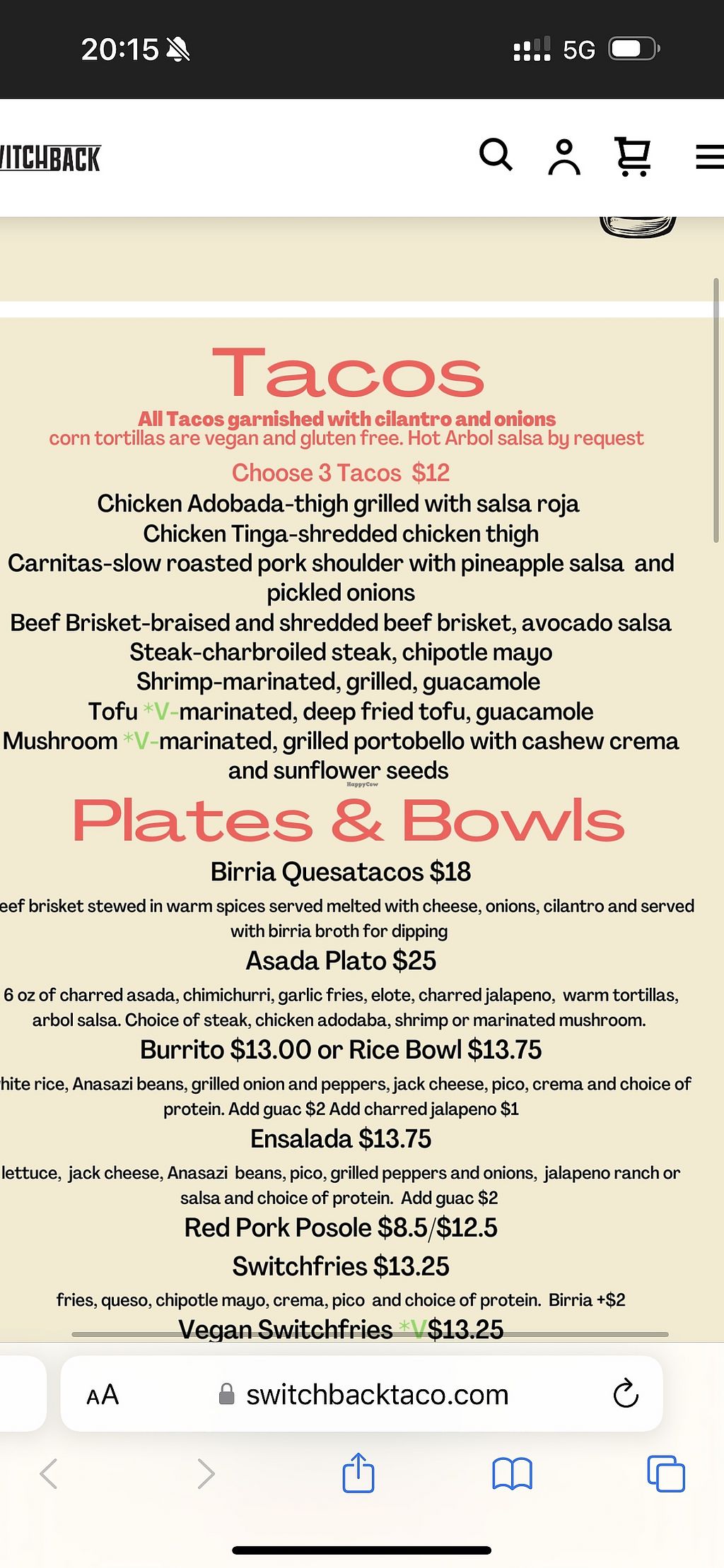 We are traveling through Durango and happened upon Switchback as we were walking around DT area. I got the mushroom taco and the tofu taco. We also tried the vegan street corn in a bowl. Everything was very flavorful. The cashew cheese sauce was delicious and the server was helpful. Some of the best vegan tacos I've ever had, tbh. Would definitely return.