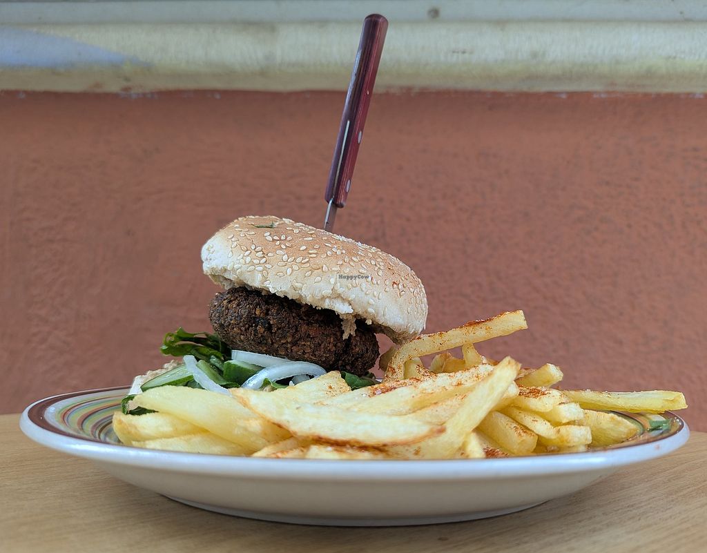 The only vegan option is falafel served in different ways. The Falafel Burger included tomato, onion, cucumber, lettuce, and mustard sauce, and was served with French fries. The burger was difficult to eat because it was so tall and there was too much bun.
