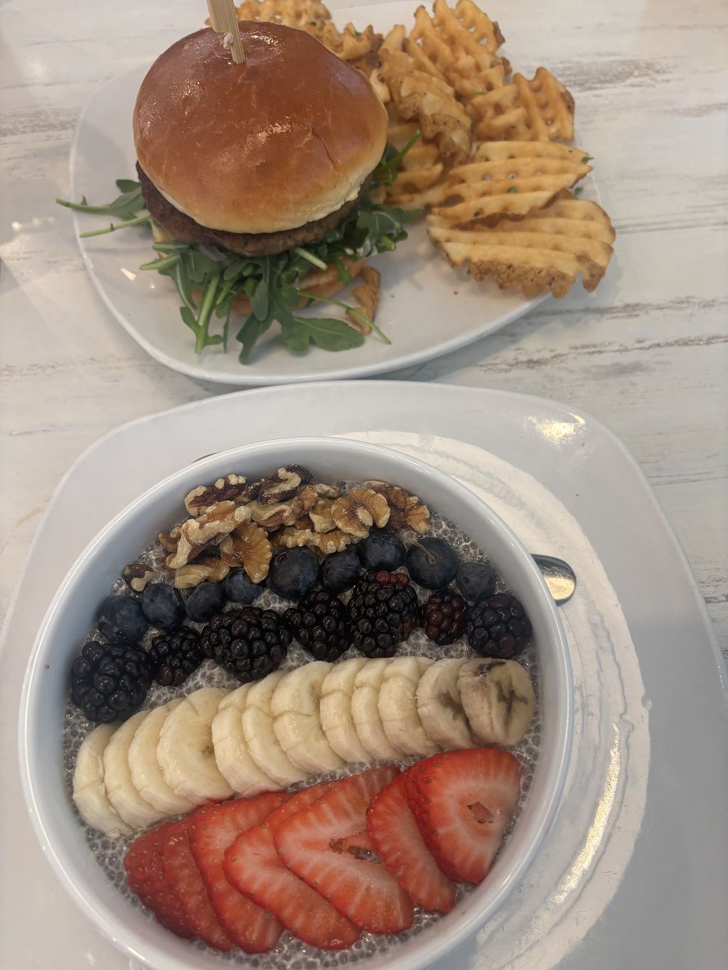 This spot has a cute modern diner deal with a few options that can be modified to be vegan. We had the chia berry pudding no honey and the impossible burger. Both were flavorful, although next time I’d sub syrup for the missing honey on the bowl to add a little sweetness