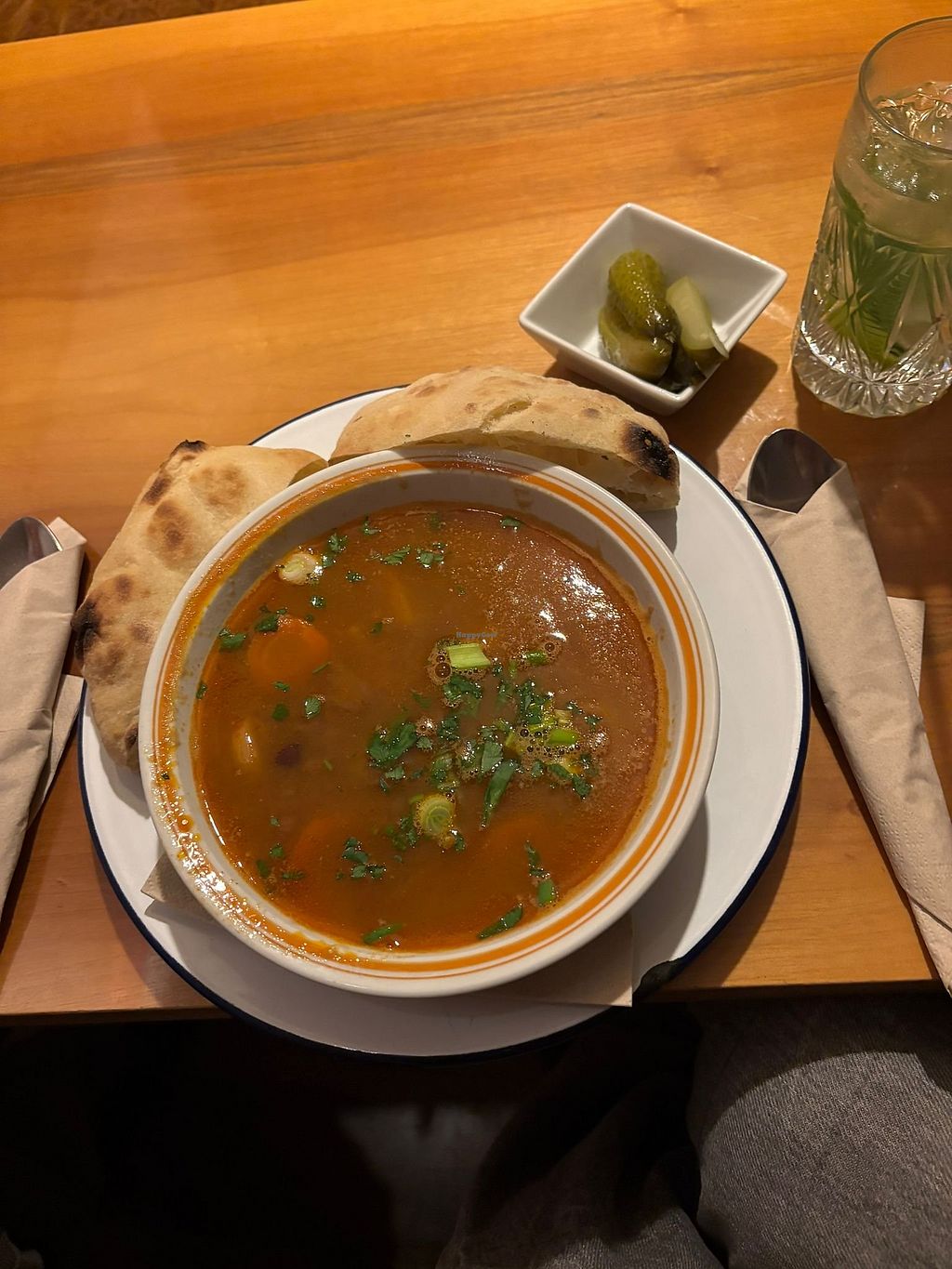 The place itself has a nice vibe, with some oitdoor seating, and the staff is super friendly and helpful. We tried the daily menu (available on every weekday, consists of a soup and a main dish for 2990,-) which was a french onion soup and penne with a tomato-mushroom sauce - both of them were delicious and they gave rather big portions. And i also had to try the not Fish & chips, made out of jackfruit, and it was just perfect, i would definitely recommend that to try once!