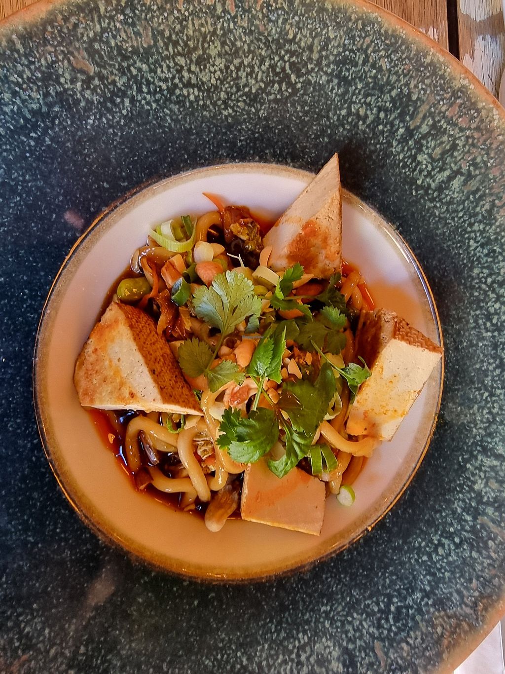 Serves meat, vegan options available. Restaurant and bar with cool interior. It has some clearly labelled vegan dishes., Udon noodles with tofu