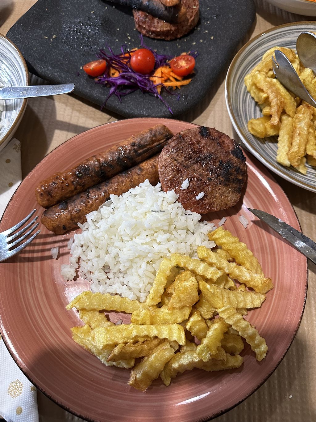 Opção de prato Burger e salsicha veganos. Acompanhamento escolhido bat…