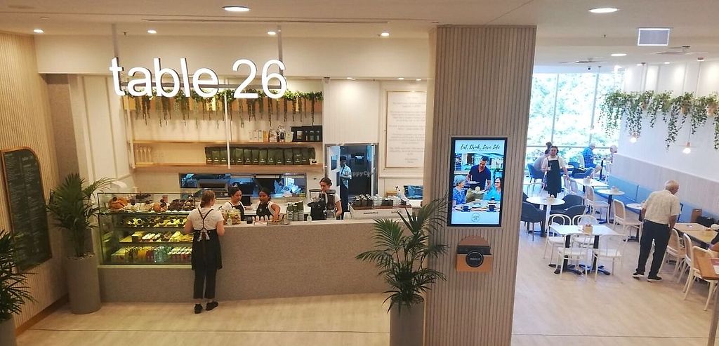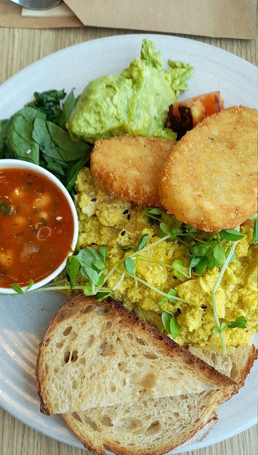 The "vegan 26er" (big breakfast) was tasty and indeed big. They'd run out of mushrooms but added more scrambled tofu. Nice view through big windows. Beware that most window seats appear to be leather. Good staff. Also vegan: tropical green or acai smoothies, chips, falafel roti wrap, nuggets and tom sauce, 3 choices of protein bowls, cake, etc.