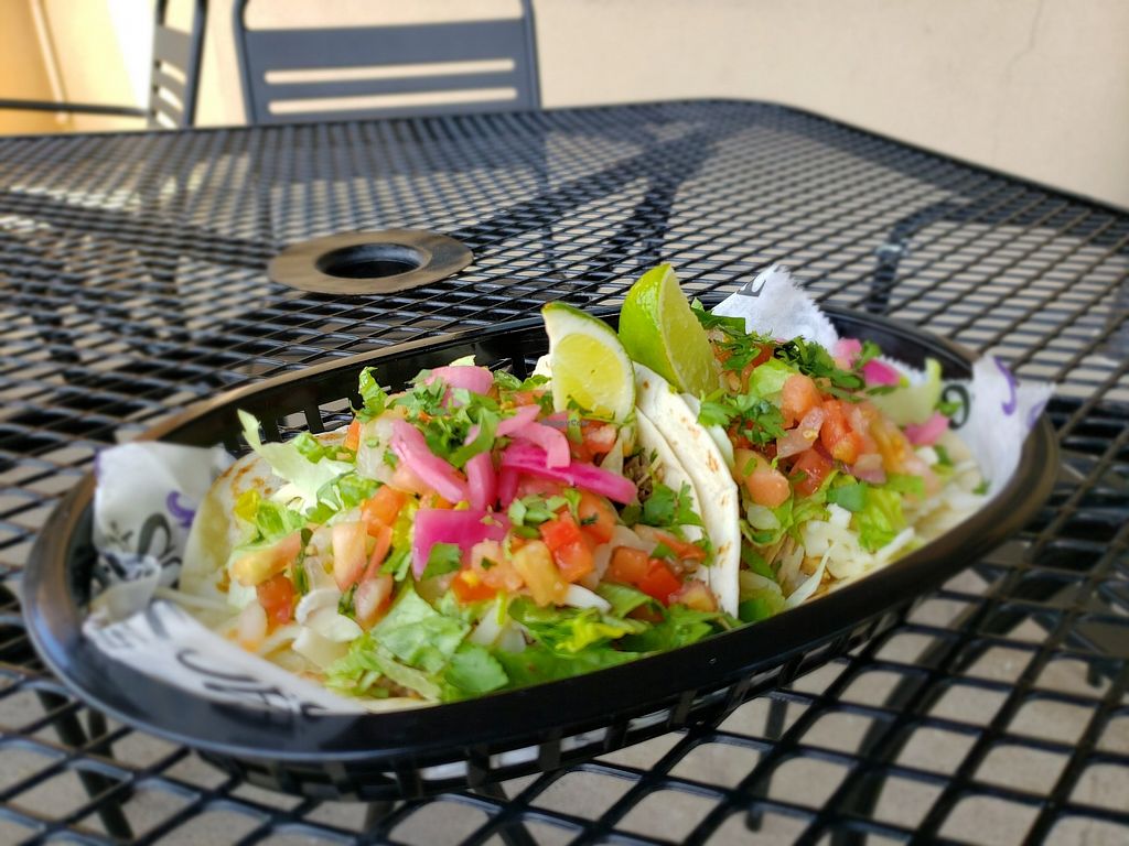 Serves meat, vegan options available. Florida-based group of taco trucks & eateries offering a tostada, burrito, tacos, quesadilla, porta, papos, and bowl. Vegan fillings include butternut squash, portobello mushroom, Gardein steak, PlantFare chicken, and Violife vegan cheese as an add-on for all items. Reported closed March 2021.