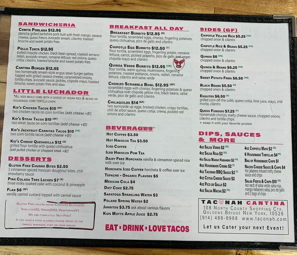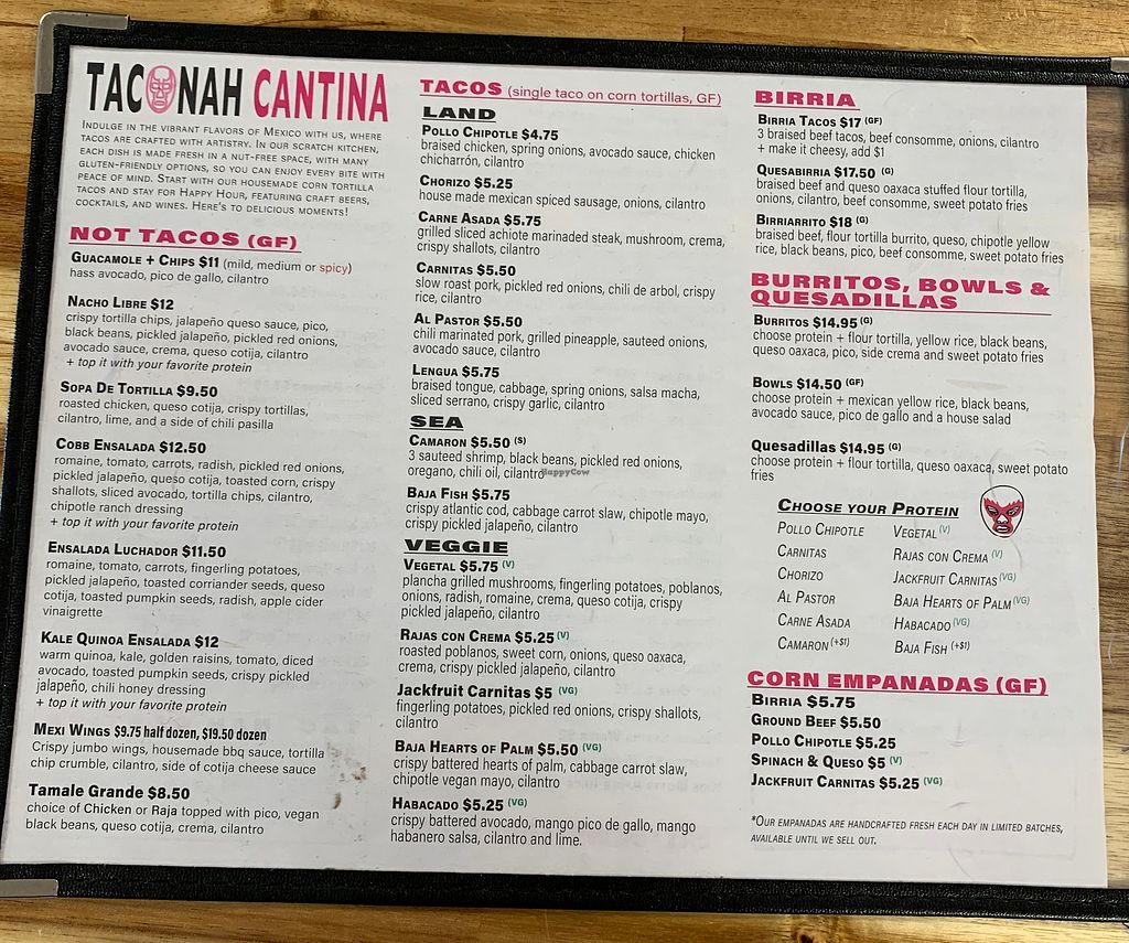 Serves meat, vegan options available. Mexican restaurant with vegan choices. Example dishes include vegan hearts of palm burritos and tacos, quinoa breakfast burrito, jackfruit carnitas and fried avocado. Menu is clearly labeled. Open Mon-Sun 11:00am-9:00pm.