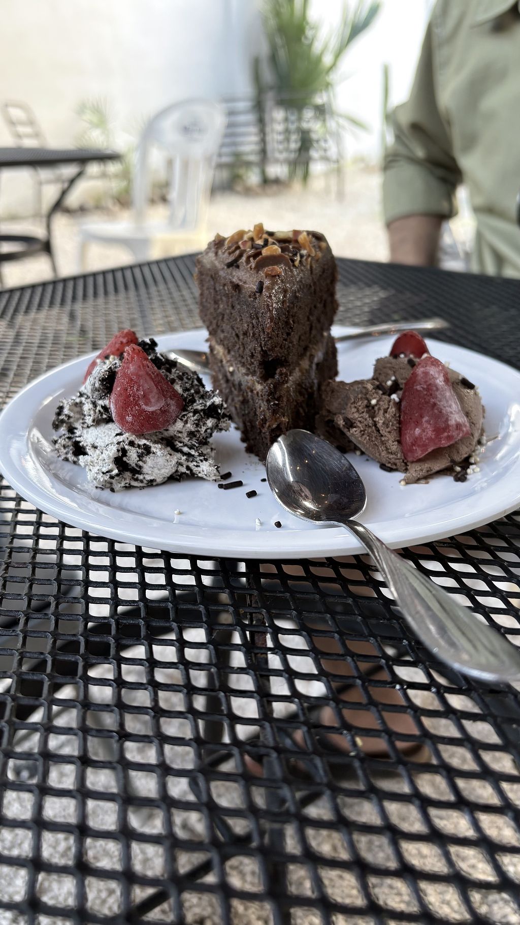 We started with nachos and four different dips. Then we ordered a bistec burrito, a torta milanesa especial, plus one taco pastor and one chorizo taco with cheese. We also got a chocolate cake for dessert, and they even gave us two scoops of ice cream on the house.