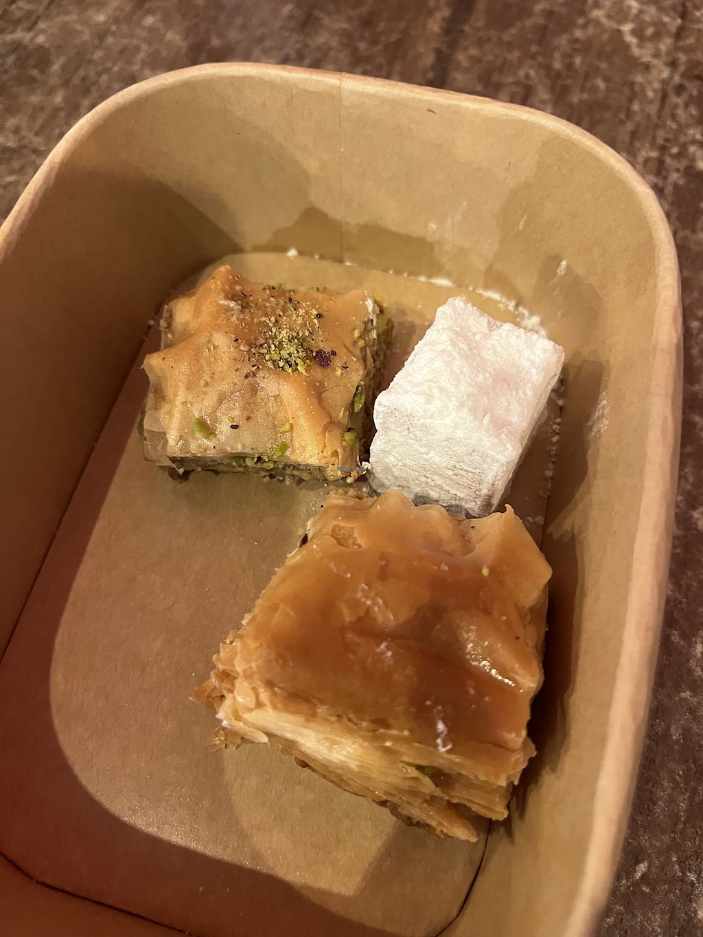 This is an intimate family like restaurant with predominantly indoor seating but some outdoor seating too. So the seating is a little cramped as a result. For starters we ordered three Mixed Vegan Hara Tapas i.e., the Batata, Koussa and Batinjan Hara. For mains we had two Cauliflower & Potato Tagine’s and a Mousaka Tagine. And then for dessert we had three Baklavas. All we absolutely delicious, especially the mains with the Couscous instead of Rice. Very good value for money. Good service too.