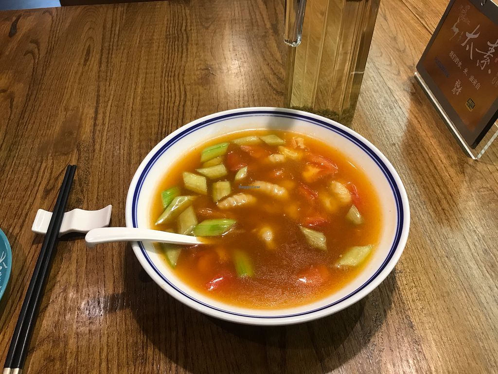 Tomato, cucumber, and some kind of pasta in tomato soup