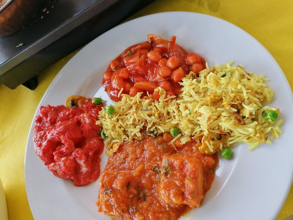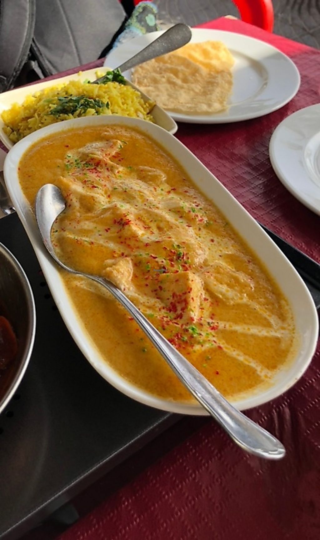 Tofu in a creamy almond sauce with papadums and garlic rice