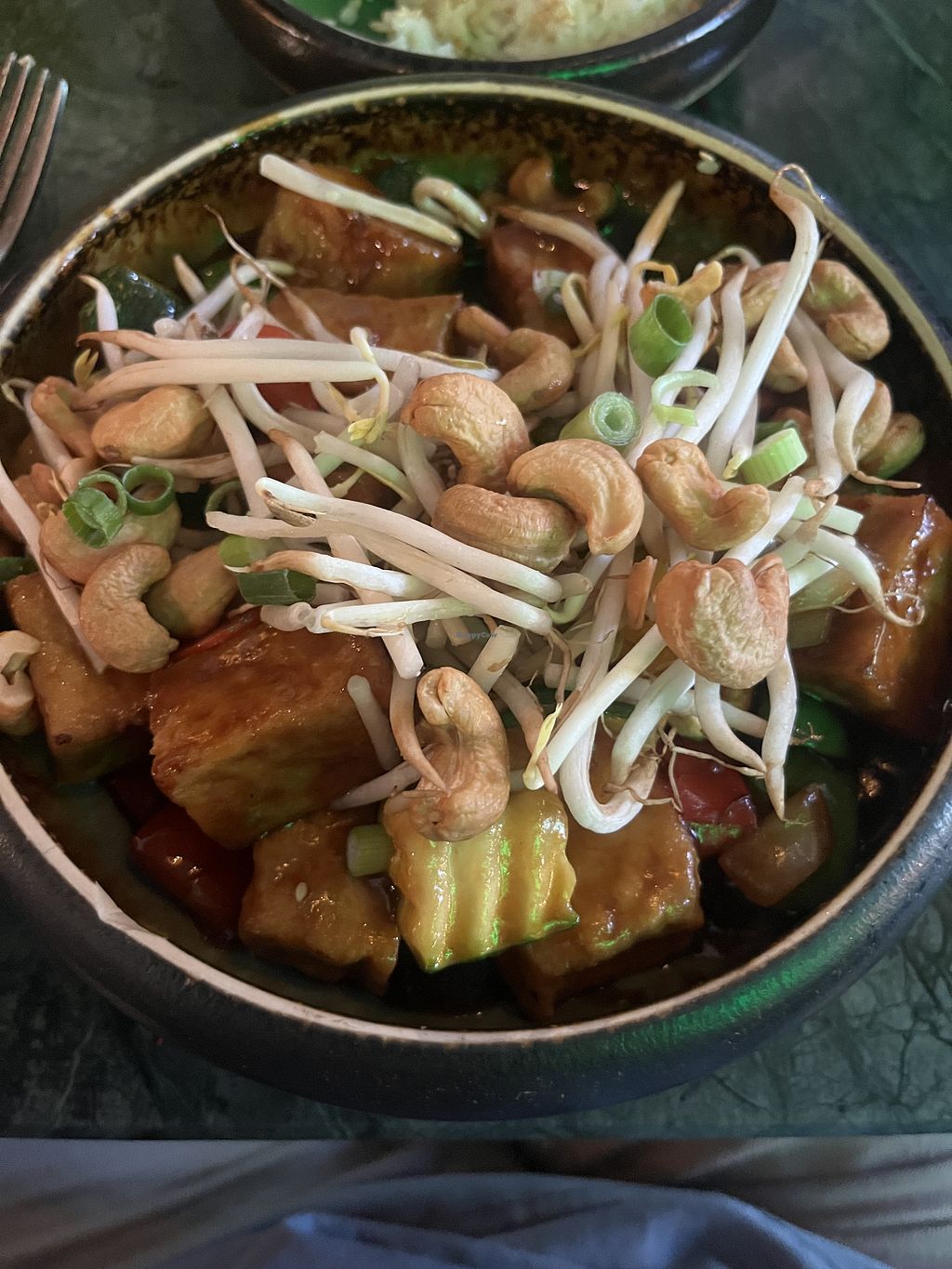 We spotted just four vegan options on the menu (only available on polish). Thai rolls, a soup, a curry and crispy cashews with tofu on soy sauce. We took the last dish and it was fine.