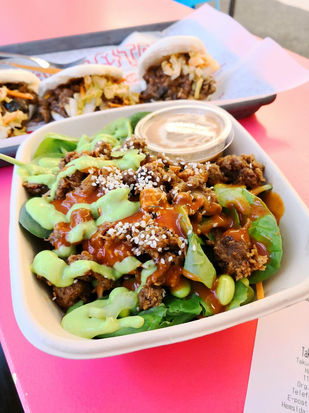 Tasty food, but since there's so much food per bun, it's tricky to eat without ending up with food everywhere. Guessing the buns aren't the expensive part, they could just add more, with less fillings per bun.