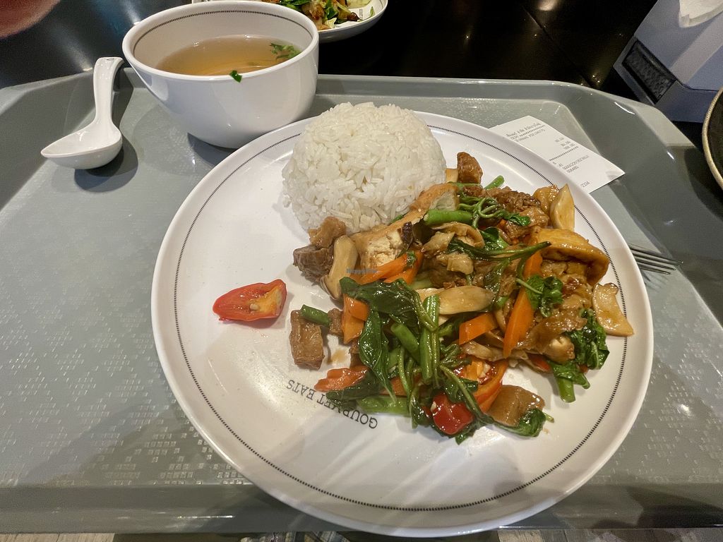 Stir-fried mixed vegetables and tofu with basil and rice, 80 baht