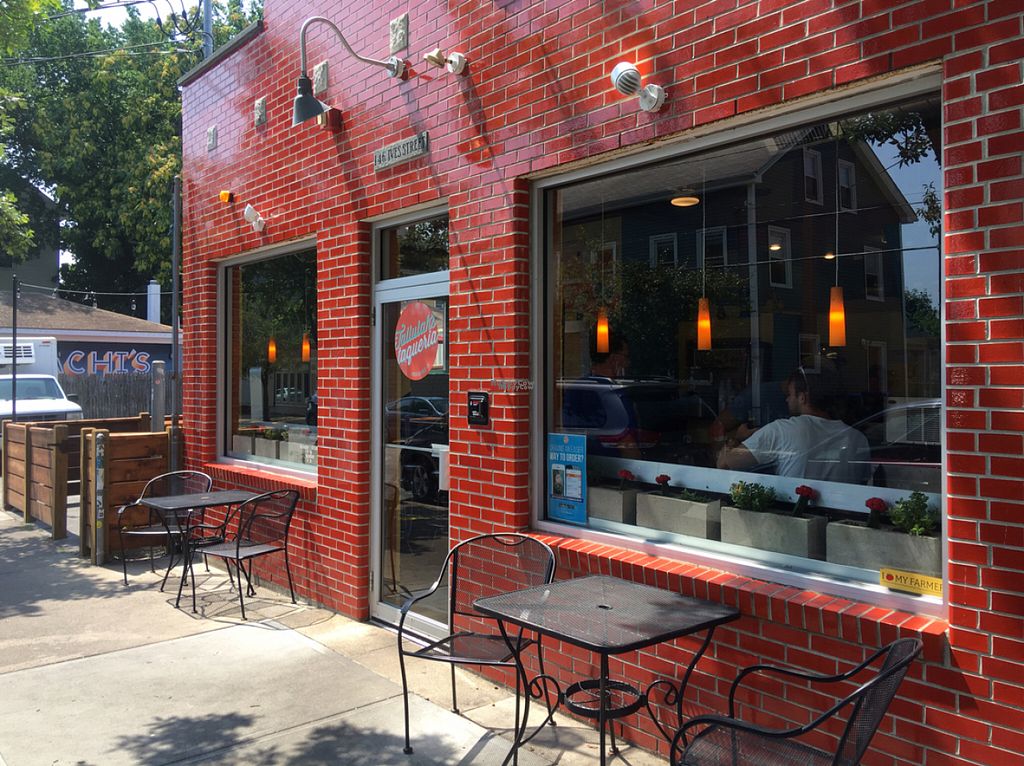 outdoor seating on both sides of building