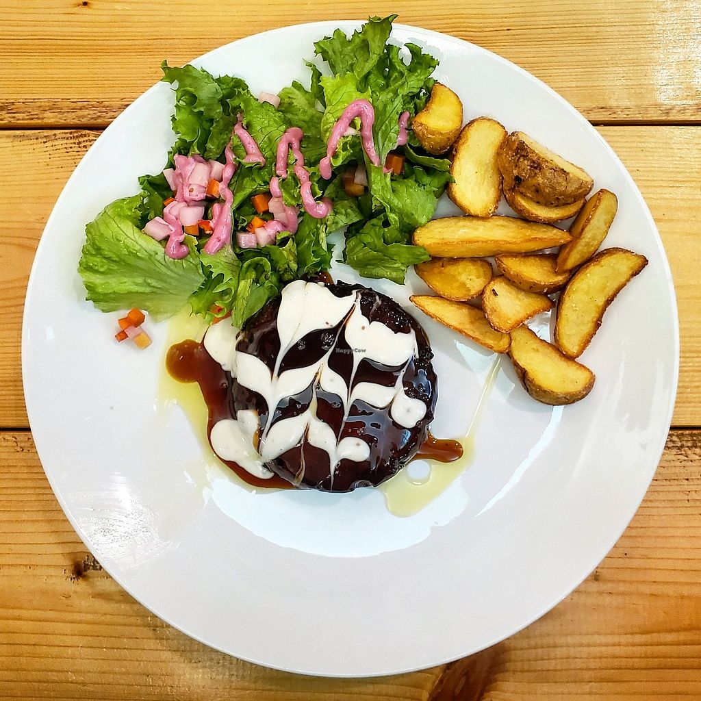 The menu features a decent selection of western dishes. You can find burgers, plates, desserts and more. Dinner time has a slightly bigger menu. The hamburg steak plate has a plant-based steak with sweet teriyaki sauce. The texture is slightly soft and the potion is rather small. The soft serve ice cream and brownie are nice but the brownie is a bit dry.